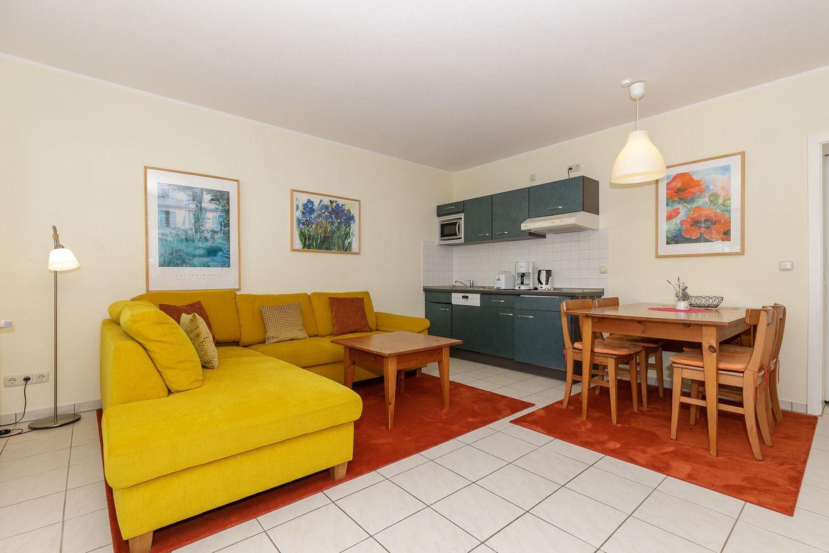 Das strandnahe, ruhige und freundliche 3-Zimmer-Maisonette-Appartement 210 (ca. 50 m²) mit innenliegender Treppe erstreckt sich über 2 Etagen (Erdgeschoss und 1. Obergeschoss) im Innenhof des Hauses A. Das Appartement besitzt ein hohes Maß an Funktionalität und ist komplett eingerichtet. Die Räume im Erdgeschoss (Küchen-, Ess- und Wohnbereich sowie Bad / WC) sind gefliest, die beiden Schlafzimmer im Obergeschoss sind mit Teppichboden ausgestattet.