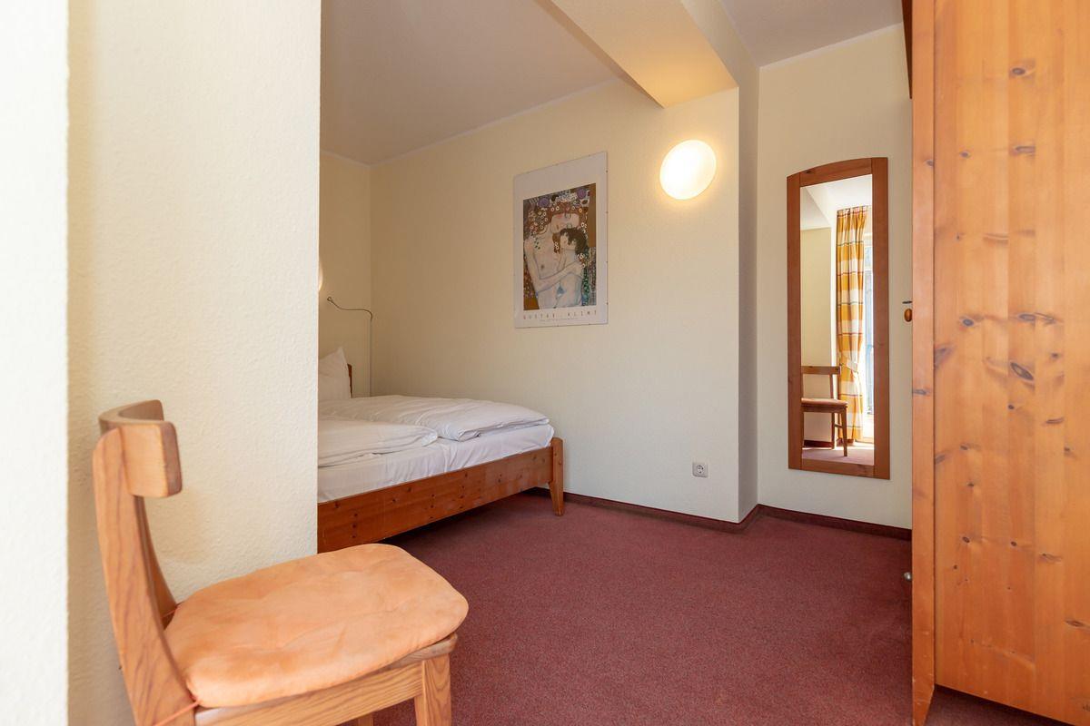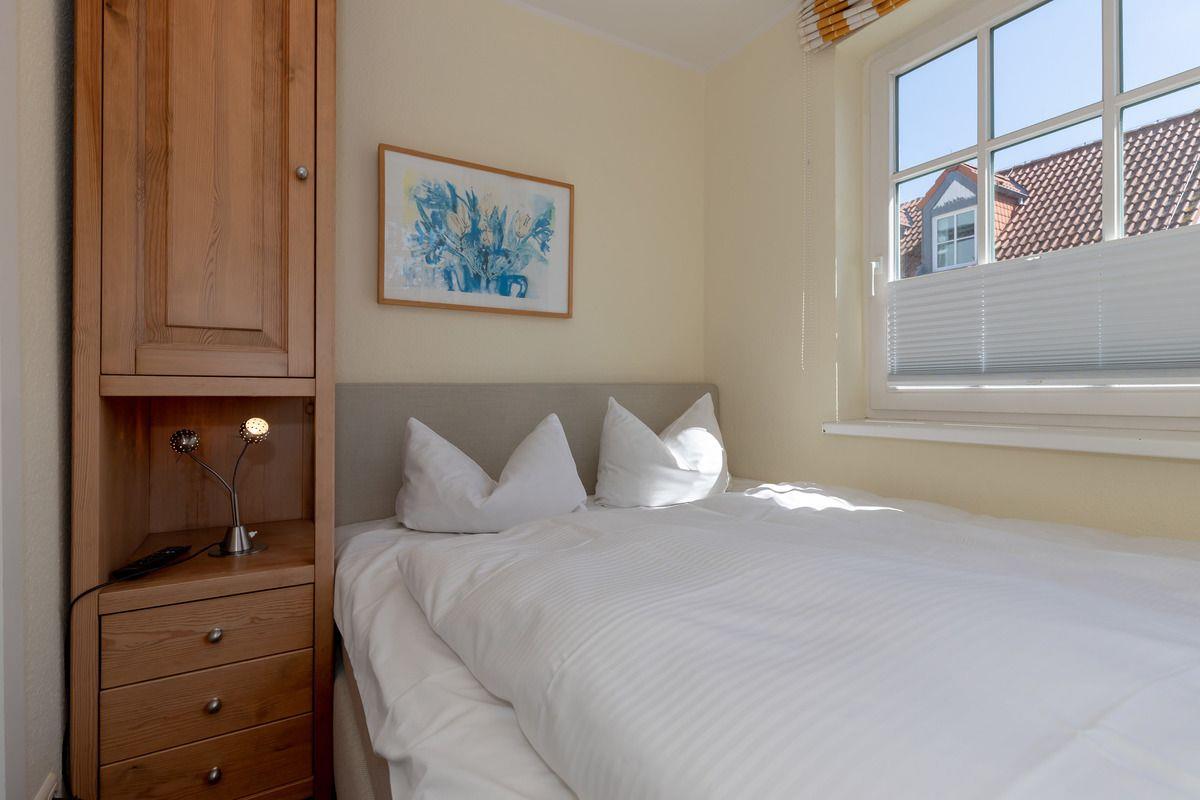 Das gemütliche 1. Schlafzimmer ist mit einem bequemen Doppelbett (2 x 80 cm x 200 cm), Nachttischen mit Nachttischlampen, einem geräumigen Kleiderschrank, einer Kommode (im Flur), einer Garderobenleiste, einem Wandspiegel sowie 2 Stühlen eingerichtet und hat direkten Zugang zu einer 9,5 m² großen und sonnigen Dachterrasse (nach Süd-Osten zum Innenhof ausgerichtet) mit Sonnenliegen.
