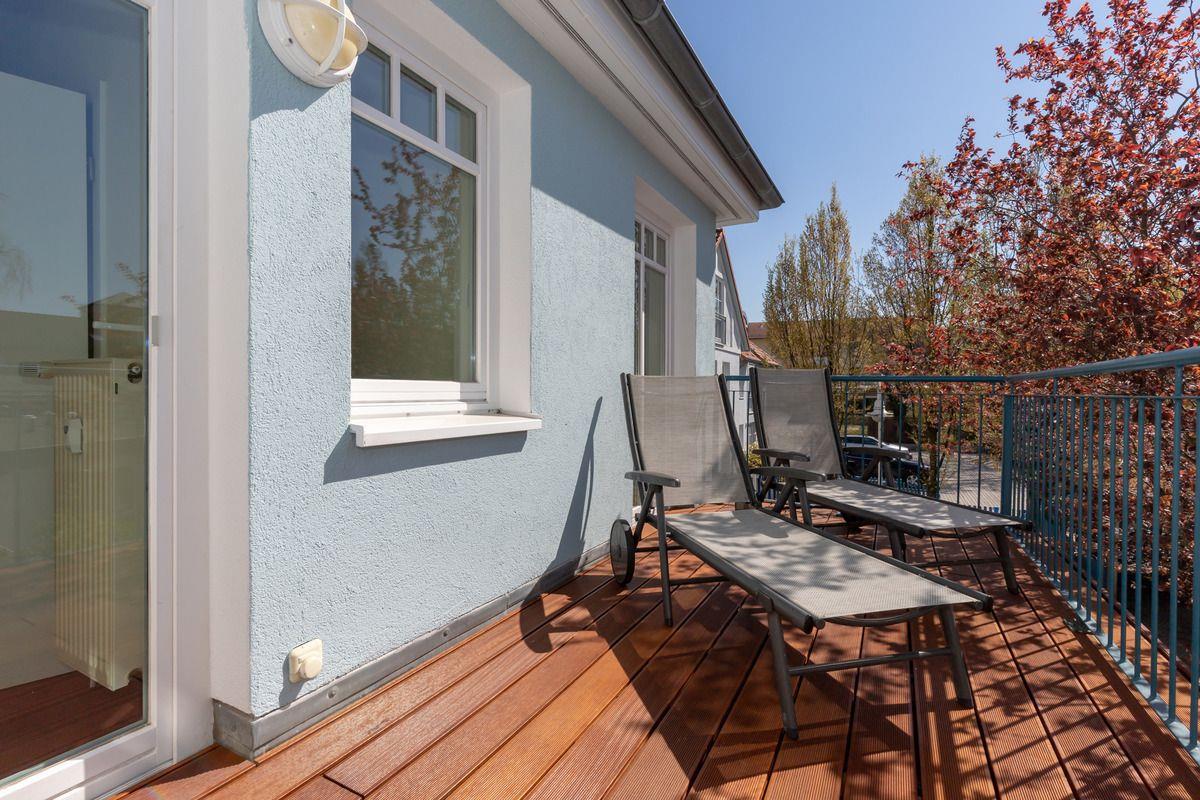 Das geräumige und helle Wohn-/Esszimmer verfügt über eine separate Sitzgruppe mit bequemer (Schlaf-)Couch, einen Korbsessel und Couchtisch, einen separaten Esstisch mit Stühlen sowie eine Vitrine. Vom Wohnzimmer aus haben Sie direkten Zugang zu der ca. 12 m² großen und sonnigen Terrasse (nach Süd-Osten zum Innenhof ausgerichtet) mit Gartenmöbeln. Hier sitzen Sie entspannt und gemütlich im Grünen und können abends bei einem guten Glas Wein in Ruhe die lauen Sommernächte genießen!