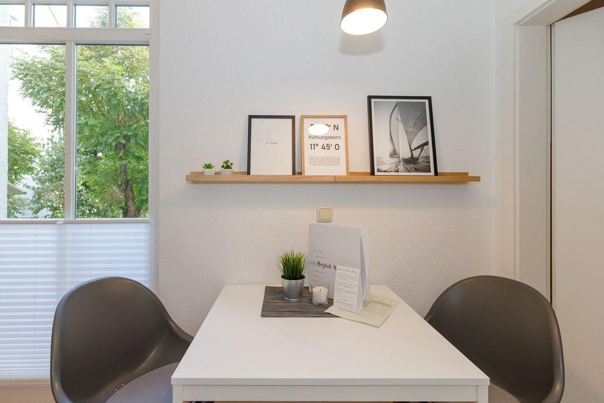 Das freundliche und helle Wohn-/Esszimmer verfügt über eine separate Sitzgruppe mit bequemer Couch, einer Sitzbank (mit zusätzlichem Stauraum) und Couchtisch, einen separaten Esstisch mit Stühlen sowie ein kleines Sideboard. Vom Wohnzimmer aus haben Sie direkten Zugang zu dem ca. 3,5 m² großen und sonnigen Balkon (zum Innenhof nach Süden ausgerichtet) mit Balkonmöbeln. Hier sitzen Sie entspannt und gemütlich im Grünen und können abends bei einem guten Glas Wein in Ruhe die lauen Sommernächte genießen!