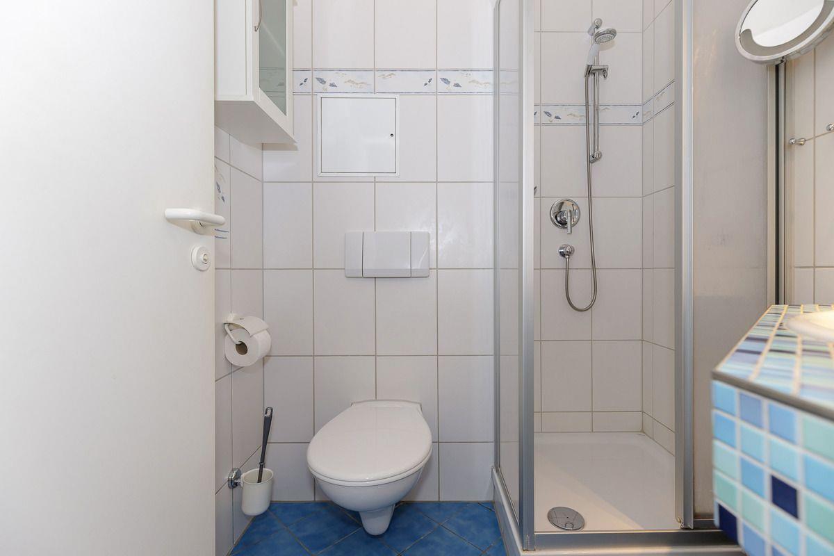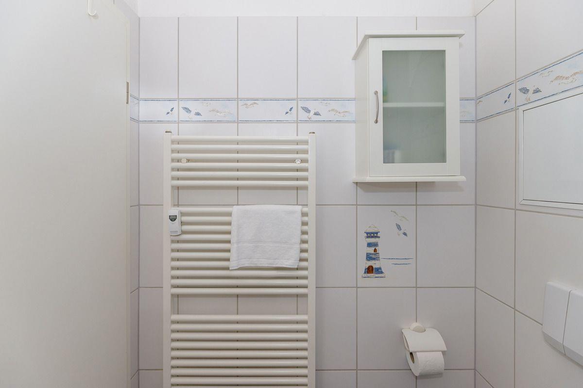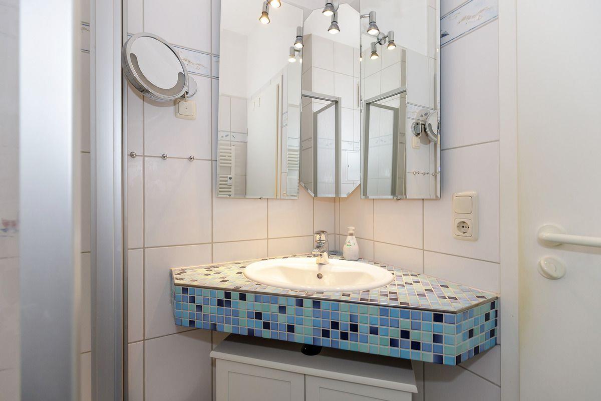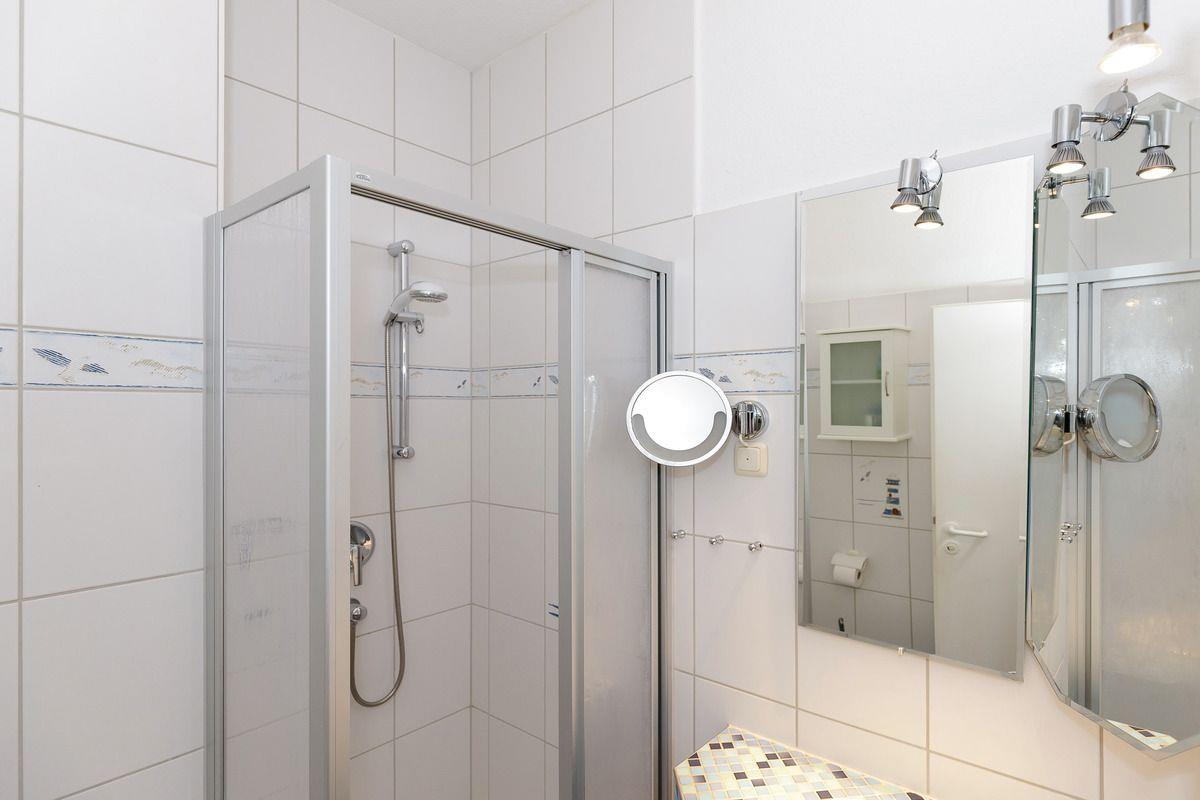 Das kürzlich renovierte Badezimmer verfügt über eine Dusche mit niedrigem Einstieg, Waschtisch mit Unterschrank, Kosmetikspiegel, Föhn, WC, einen kleinen Hängeschrank, einen Handtuch-Heizkörper sowie ausreichend Ablagemöglichkeiten.