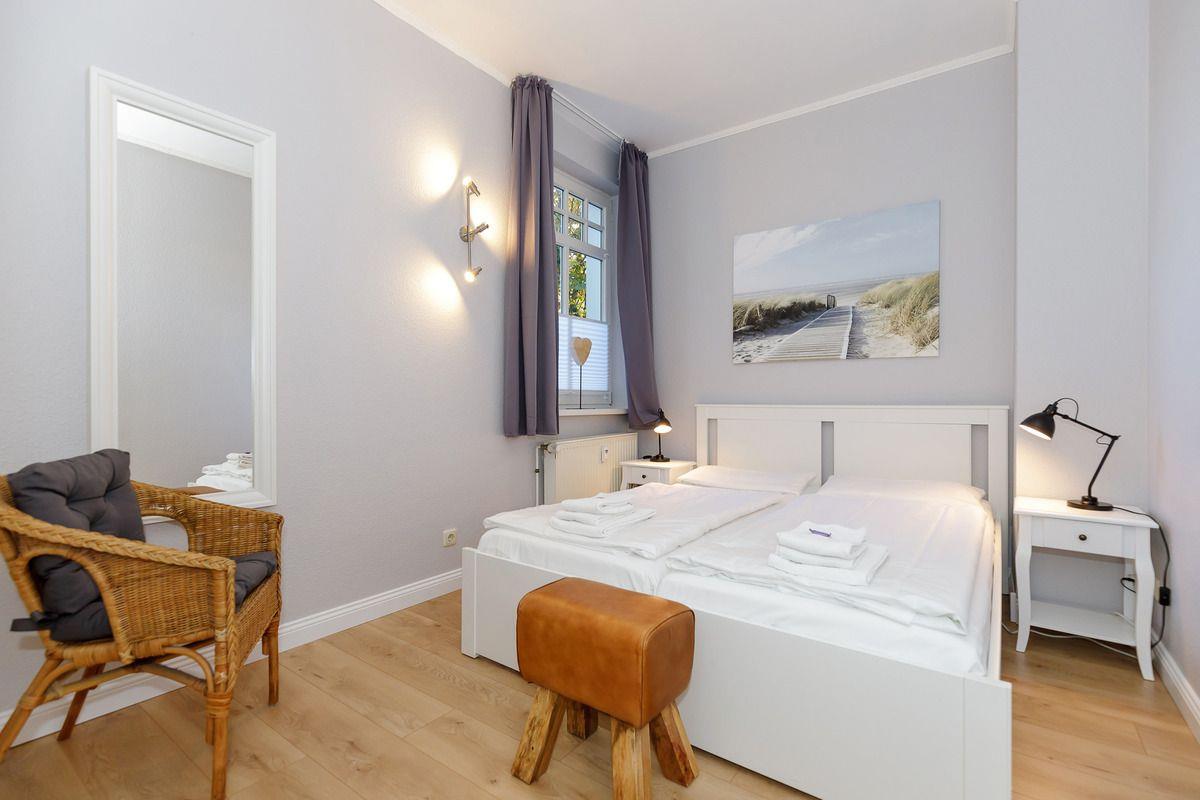 Das moderne und gemütliche Schlafzimmer ist mit einem bequemen Doppelbett (2 x 80 cm x 200 cm), Nachttischen mit Nachttischlampen, einem geräumigen Kleiderschrank, einem Korbsessel sowie einem Lederhocker eingerichtet. Für einen guten Schlafkomfort verfügt das Schlafzimmer auch über Verdunkelungsvorhänge und Plissees.