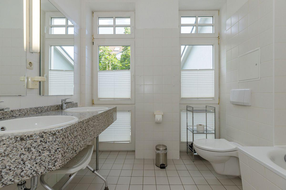 Das helle und geräumige Badezimmer (mit Tageslicht / Fenster) verfügt über eine Badewanne mit Duschtrennwand, einen Waschtisch mit 2 Waschbecken, WC, Handtuch-Heizkörper, Föhn sowie verschiedene Regale und Ablagemöglichkeiten.