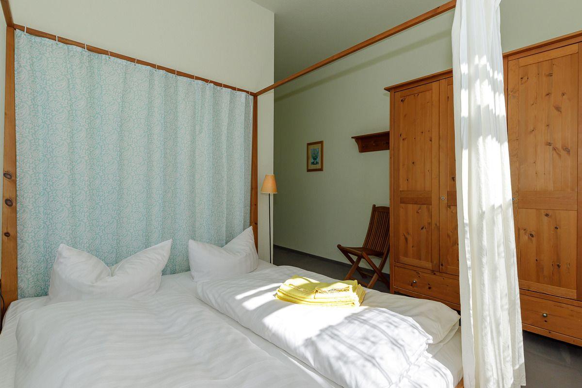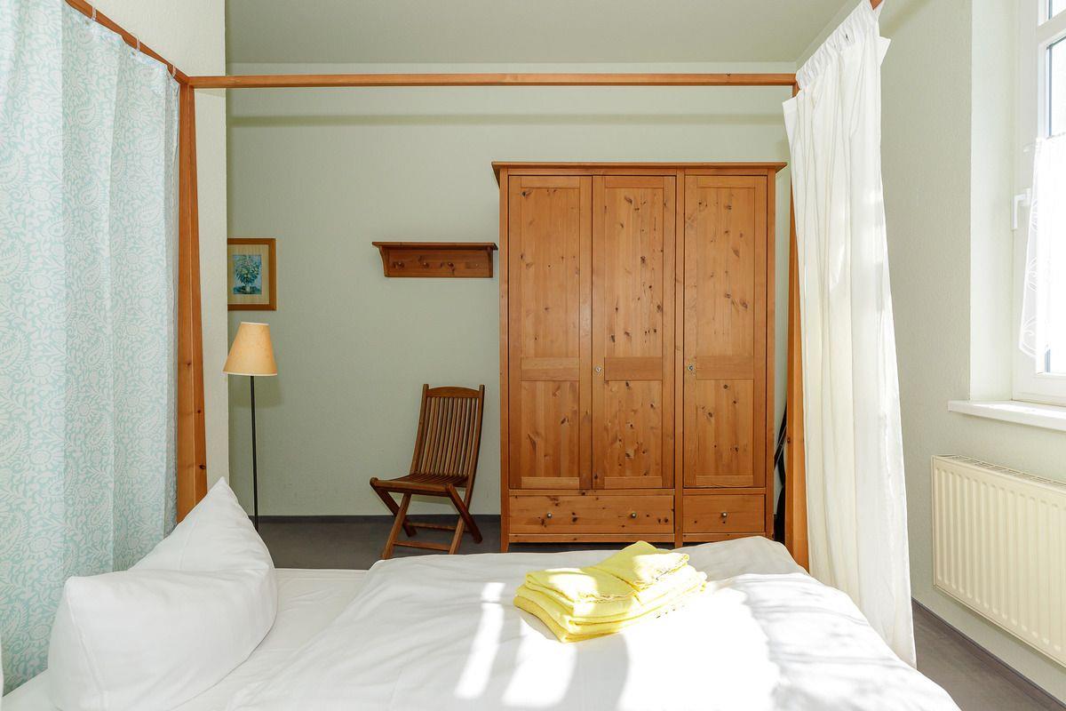 Das freundliche 1. Schlafzimmer ist mit einem bequemen Doppelbett (2 x 80 cm x 200 cm), Nachttischen mit Nachttischlampen, einem geräumigen Kleiderschrank, einer Wandgarderobe sowie einem Hocker eingerichtet.
