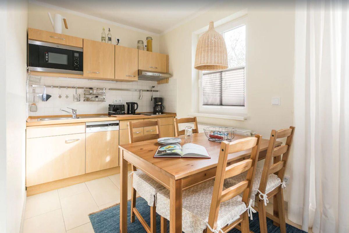 Die offene Küche beinhaltet eine voll ausgestattete Einbauküchenzeile mit 2-Zonen-Ceran-Kochfeld, Dunstabzug, Mikrowelle, Kühlschrank mit Gefrierfach, Geschirrspülmaschine, Kaffeemaschine, Wasserkocher und Toaster. Auf Wunsch stellen wir Ihnen auch gerne einen portablen Backofen zur Verfügung. Die Küche ist mit Geschirr, Gläsern, Besteck und Töpfen komplett ausgestattet.