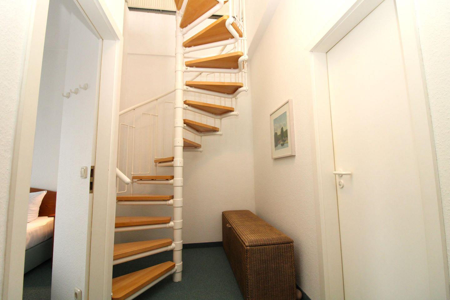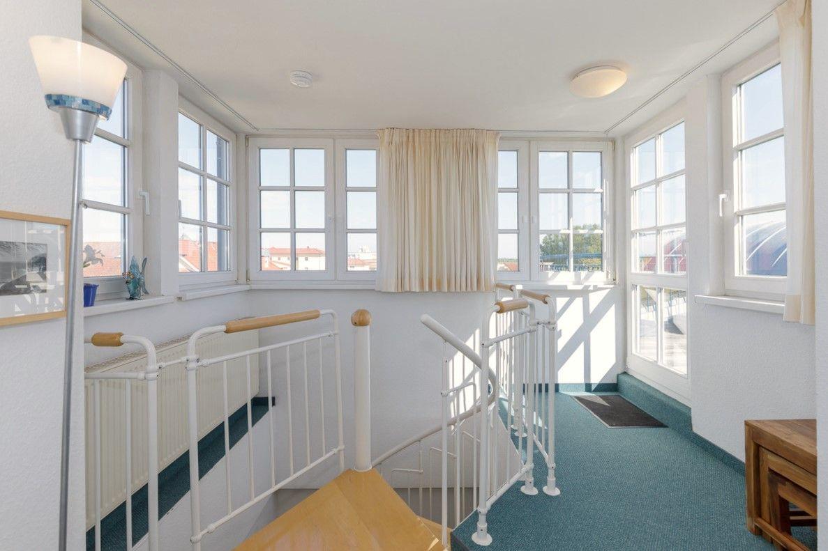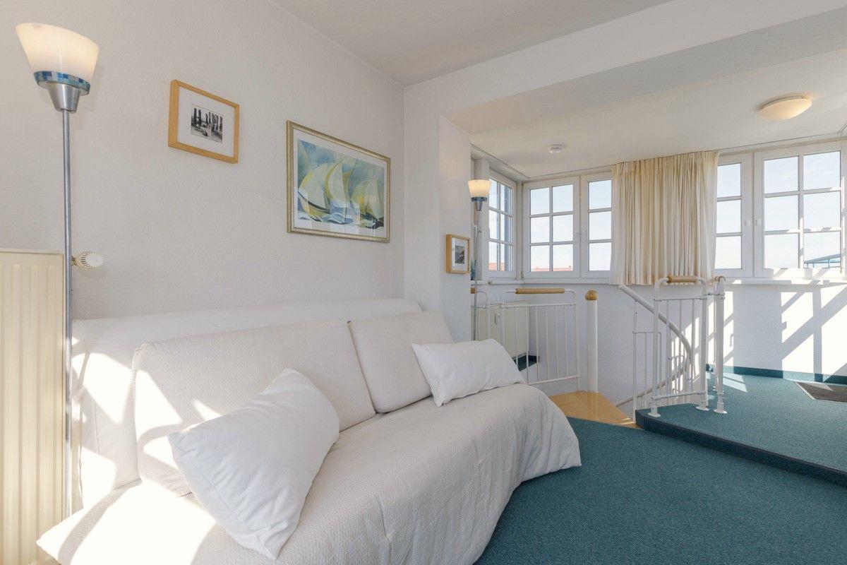 Das strandnahe und lichtdurchflutete Maisonette-TURM-APPARTEMENT 230 (ca. 80 m²) über 2 Etagen ist etwas ganz BESONDERES! Dieses Appartement im 3. und 4. Obergeschoss im Haus A (ohne Fahrstuhl) mit 2 Balkonen (im 3. OG) und einer zusätzlichen großen Dachterrasse (im 4. OG) verfügt über 3 Zimmer, ist komplett eingerichtet und besitzt ein hohes Maß an Wohlfühlkomfort. Der Bodenbelag im Wohnbereich ist Teppichboden, im Eingangs- und Küchenbereich hochwertiger Vinyl-Designbelag in edler Fliesenoptik, das Bad / WC ist gefliest.