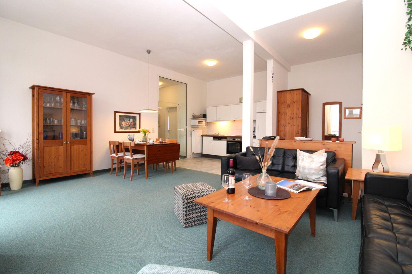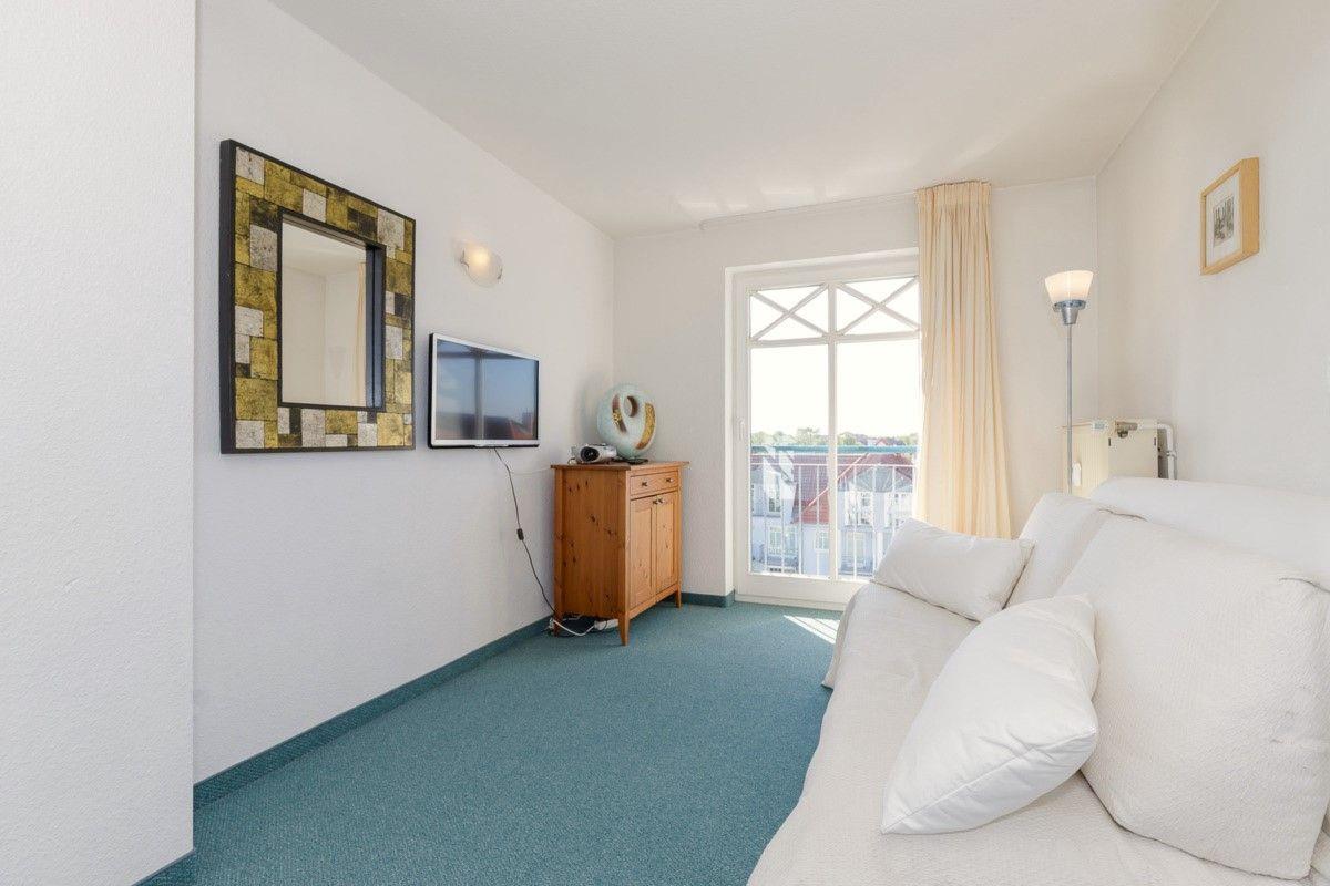 Das großzügige und lichtdurchflutete Wohn-/Esszimmer verfügt über eine separate Sitzgruppe mit 2 bequemen Ledercouchen, 2 Hockern und Couchtisch, einen separaten Esstisch mit 6 Stühlen, ein Sideboard, eine Glasvitrine sowie eine Kommode. Vom Wohnzimmer aus haben Sie über die großen bodentiefen Fenster einen wunderschönen Blick auf das muntere Treiben in der unten liegenden Strandstraße. Darüber hinaus haben Sie vom Wohnzimmer direkten Zugang zu einem ca. 3 m² großen, sonnigen sowie teilweise überdachten Balkon (nach Süd-Westen ausgerichtet) mit Balkonmöbeln und seitlichem Seeblick. Hier sitzen Sie entspannt und gemütlich und können abends bei einem guten Glas Wein in Ruhe die lauen Sommernächte genießen!