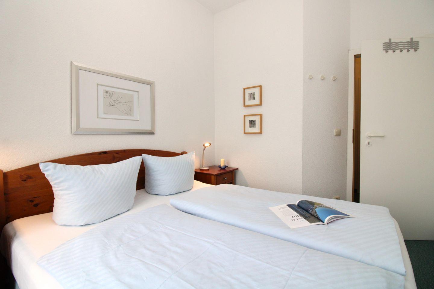 Das freundliche und helle 1. Schlafzimmer (im 3. OG) ist mit einem bequemen Doppelbett (160 cm x 200 cm), Nachttischen mit Nachttischlampen, einer Kommode sowie einem Stuhl eingerichtet. Der Kleiderschrank befindet sich in der Diele. Vom Schlafzimmer aus haben Sie ebenfalls direkten Zugang zu einem weiteren Balkon (nach Süd-Westen ausgerichtet) mit Balkonmöbeln und seitlichem Seeblick.