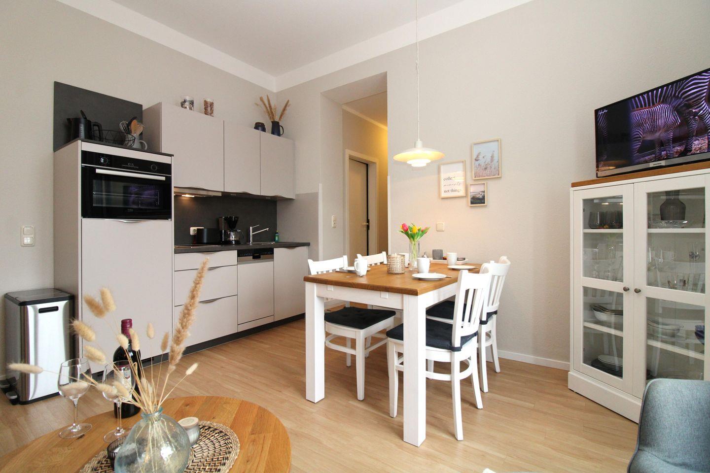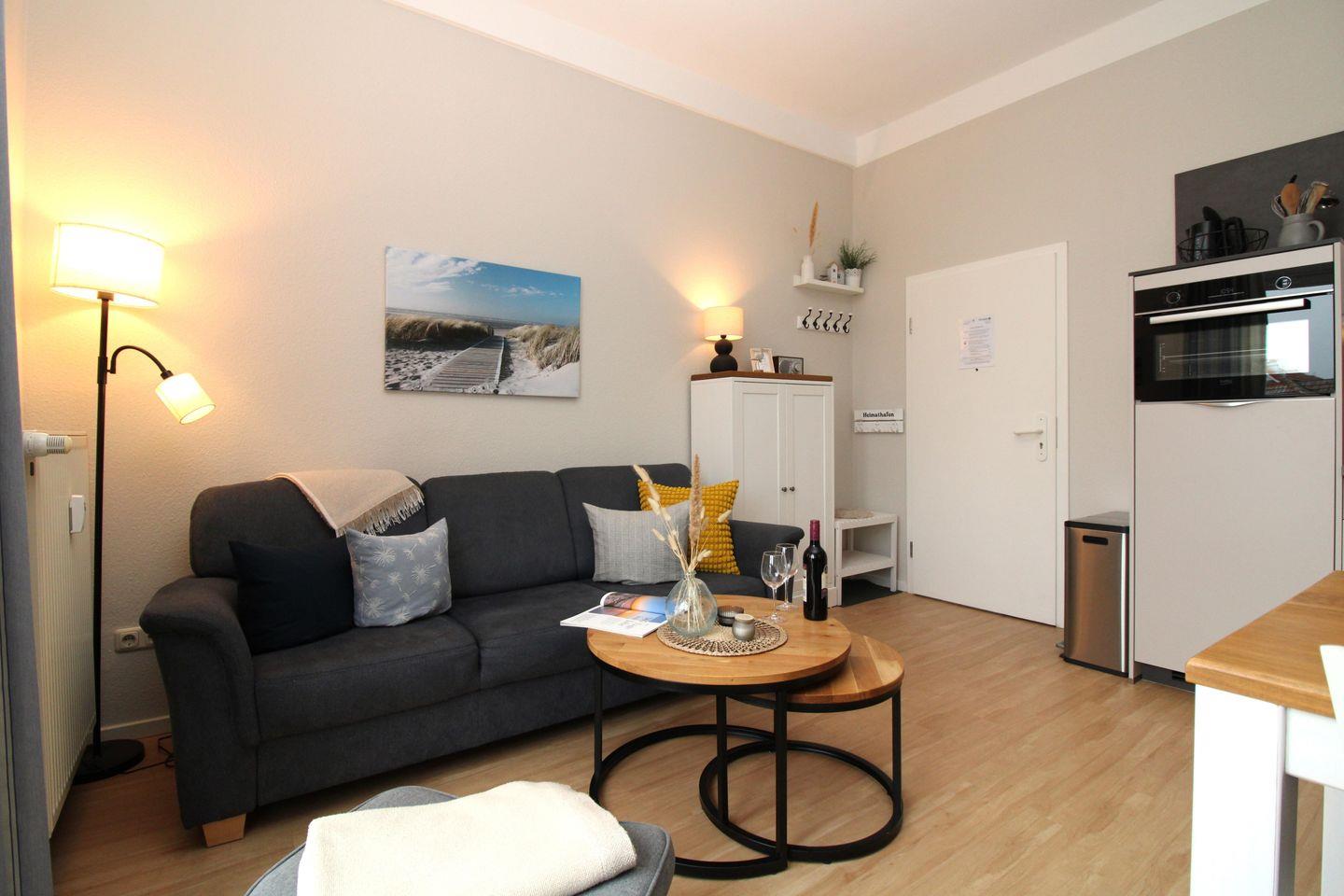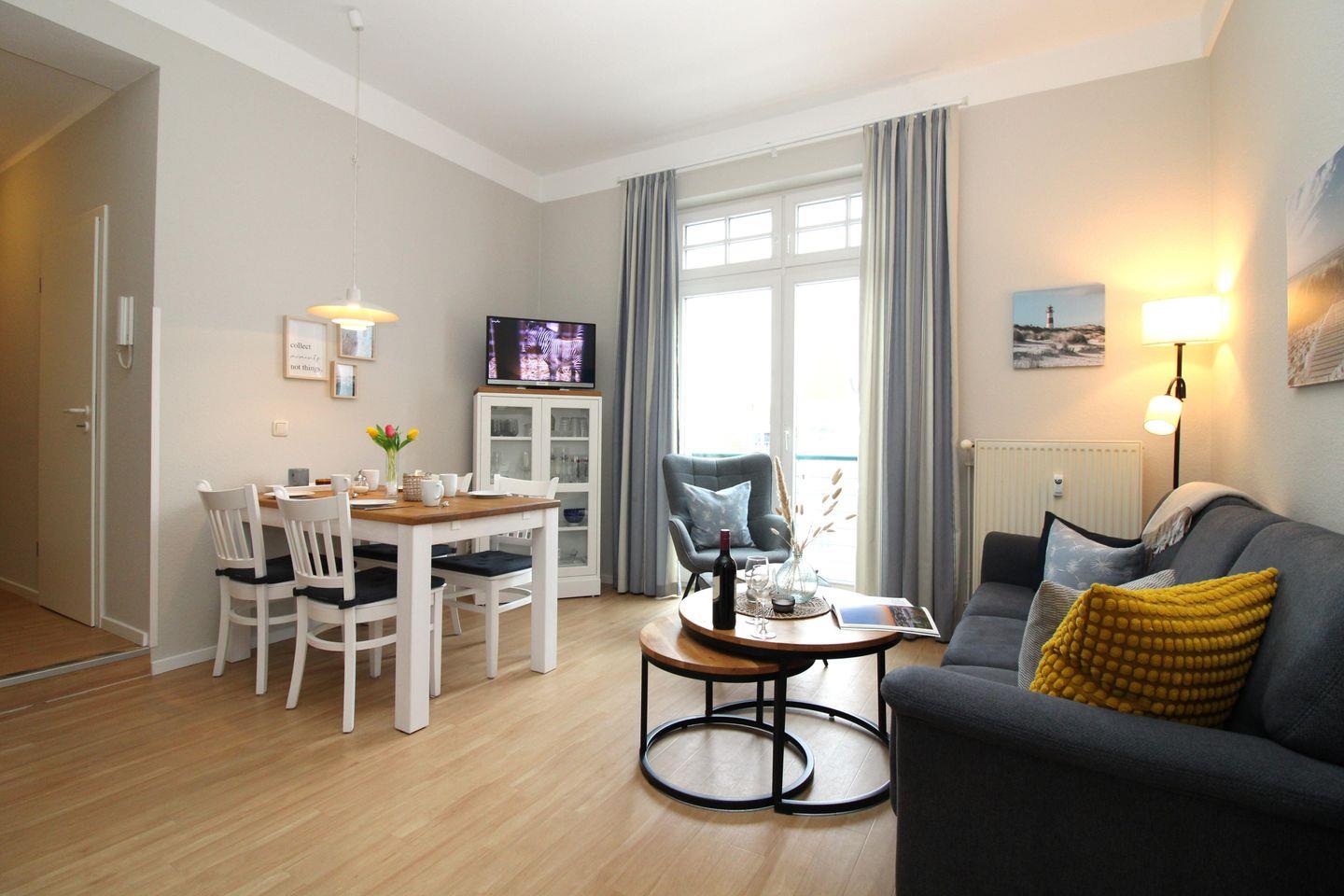 Das freundliche und helle Wohn-/Esszimmer verfügt über eine separate Sitzgruppe mit bequemer Couch, Sessel und Couchtisch, einen separaten Esstisch mit 4 Stühlen, eine Glasvitrine sowie eine Schrankkommode. Vom Wohnzimmer aus haben Sie über das große bodentiefe Fenster (französischer Balkon) einen wunderschönen Blick auf das muntere Treiben in der unten liegenden Strandstraße.