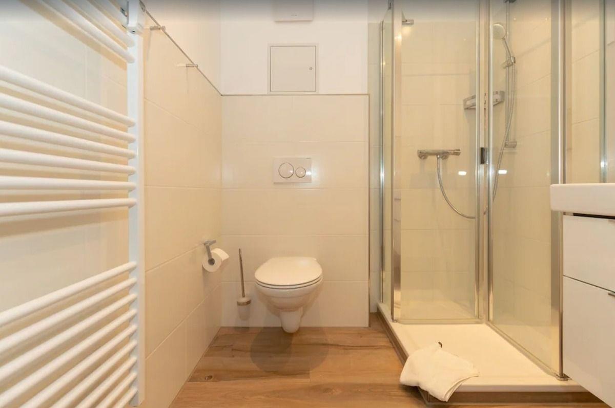 Das moderne und schöne Badezimmer verfügt über eine Echtglas-Dusche mit niedrigem Einstieg (seniorenfreundlich!), Waschbecken mit Unterschrank und großem Wandspiegel, WC, Föhn, Handtuch-Heizkörper sowie ausreichend Ablagemöglichkeiten.