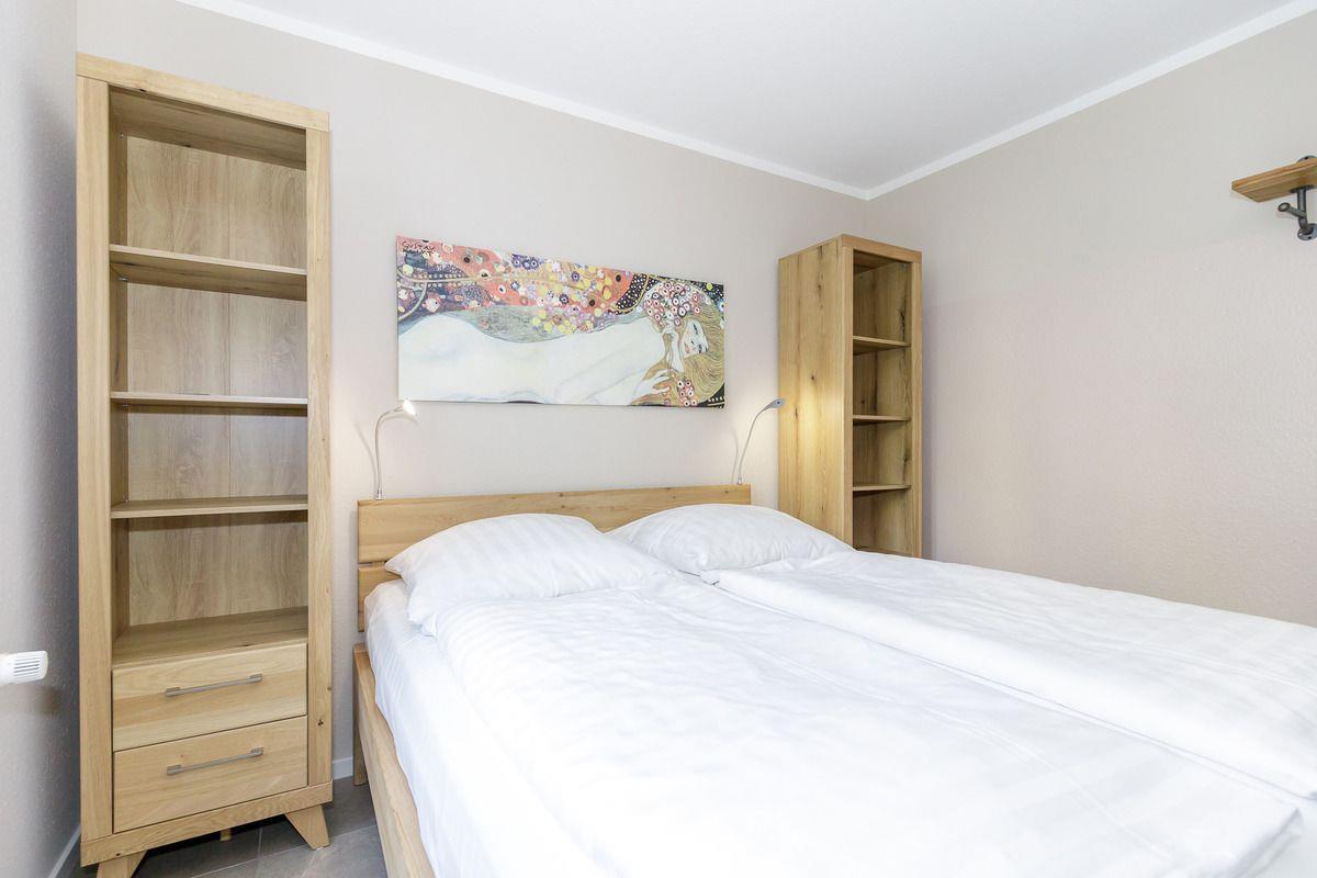 Das helle und freundliche Schlafzimmer ist mit einem bequemen Doppelbett (2 x 80 cm x 200 cm), Nachttischen mit Nachttischlampen, 2 geräumigen Regalen, einem Wandspiegel sowie einem geräumigen Kleiderschrank (im Eingangsbereich) eingerichtet. Für einen guten Schlafkomfort verfügt das Schlafzimmer über Verdunkelungs-Rollos.