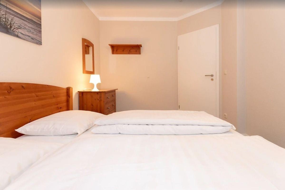 Das freundliche Schlafzimmer ist mit einem bequemen Boxspring-Doppelbett (2 x 90 cm x 200 cm), Nachttischen mit Nachttischlampen, einer Kommode, einer Garderobenleiste sowie einem Wandspiegel ausgestattet. Ihre Kleidung können Sie in einem großen begehbaren Kleiderschrank (Kammer im Nebenraum) unterbringen.