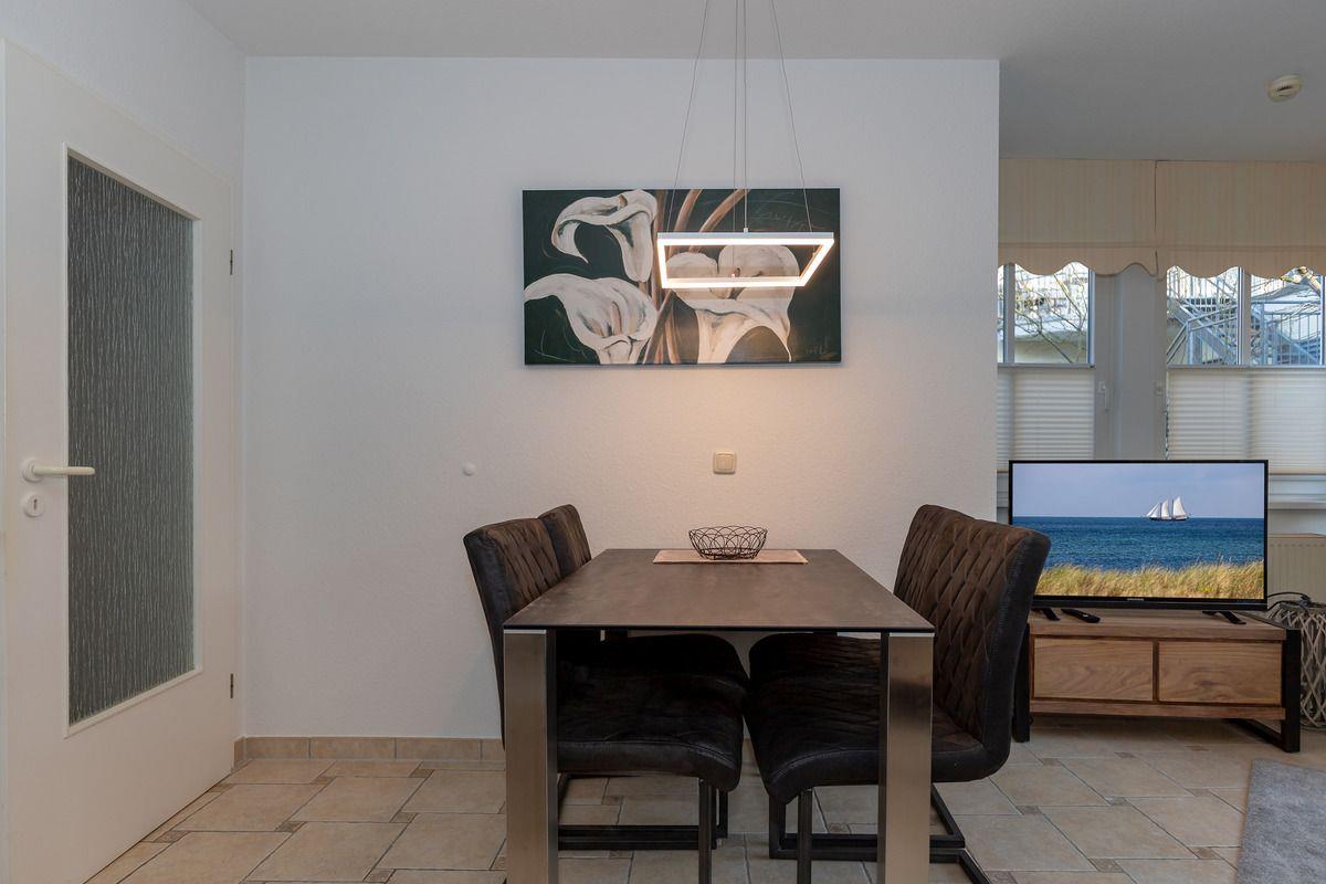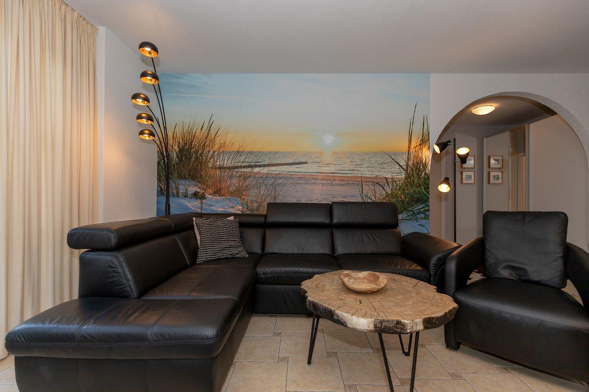 Das moderne und geräumige Wohn-/Esszimmer verfügt über eine separate Sitzgruppe mit bequemer Eck-Ledercouch, 2 Sessel und Couchtisch, einen separaten Esstisch mit 4 Stühlen sowie ein Sideboard. Vom Wohnzimmer aus haben Sie direkten Zugang zu der ca. 6 m² großen Terrasse (nach Nord-Osten ausgerichtet) mit bequemen Gartenmöbeln. Hier sitzen Sie entspannt und gemütlich im Grünen und können abends bei einem guten Glas Wein in Ruhe die lauen Sommernächte genießen!