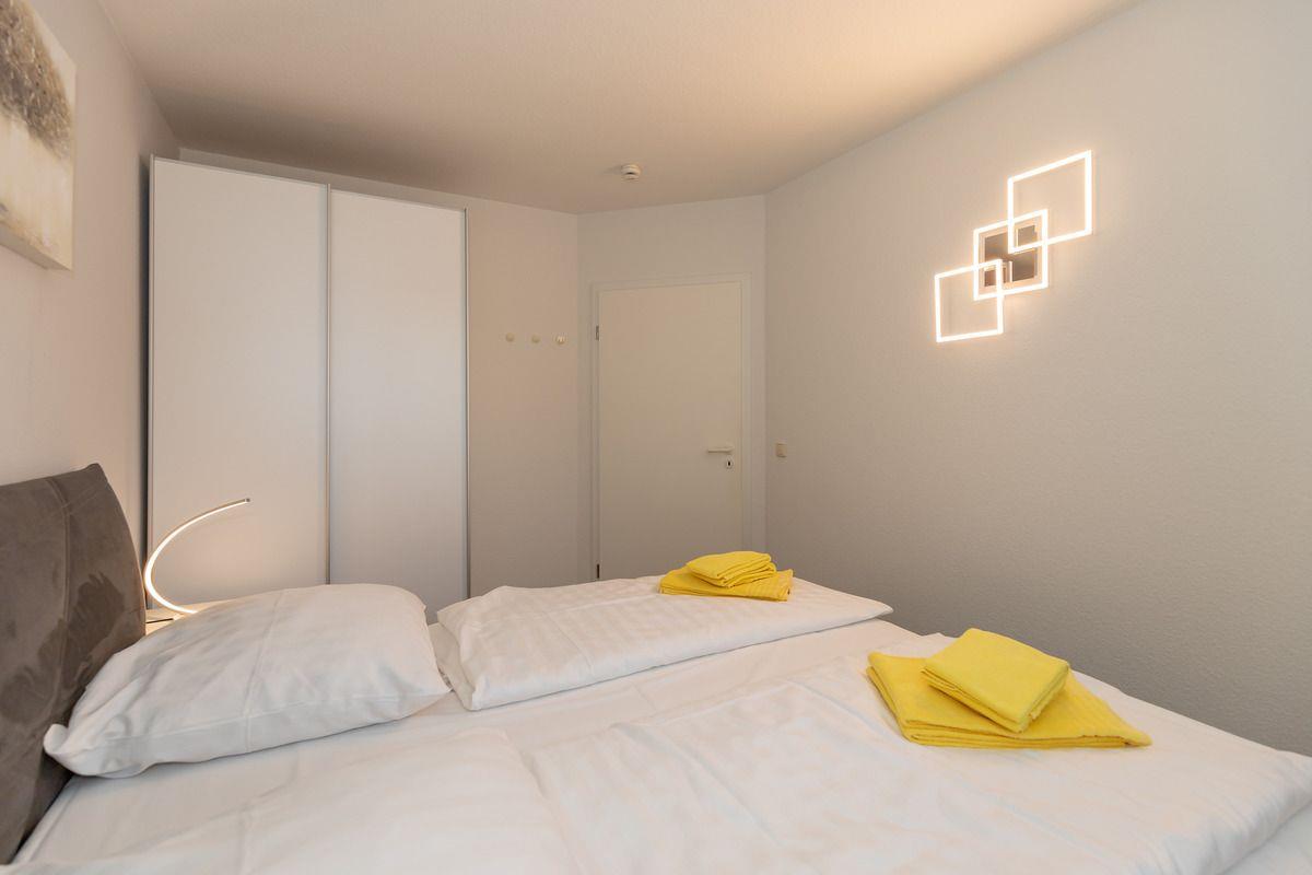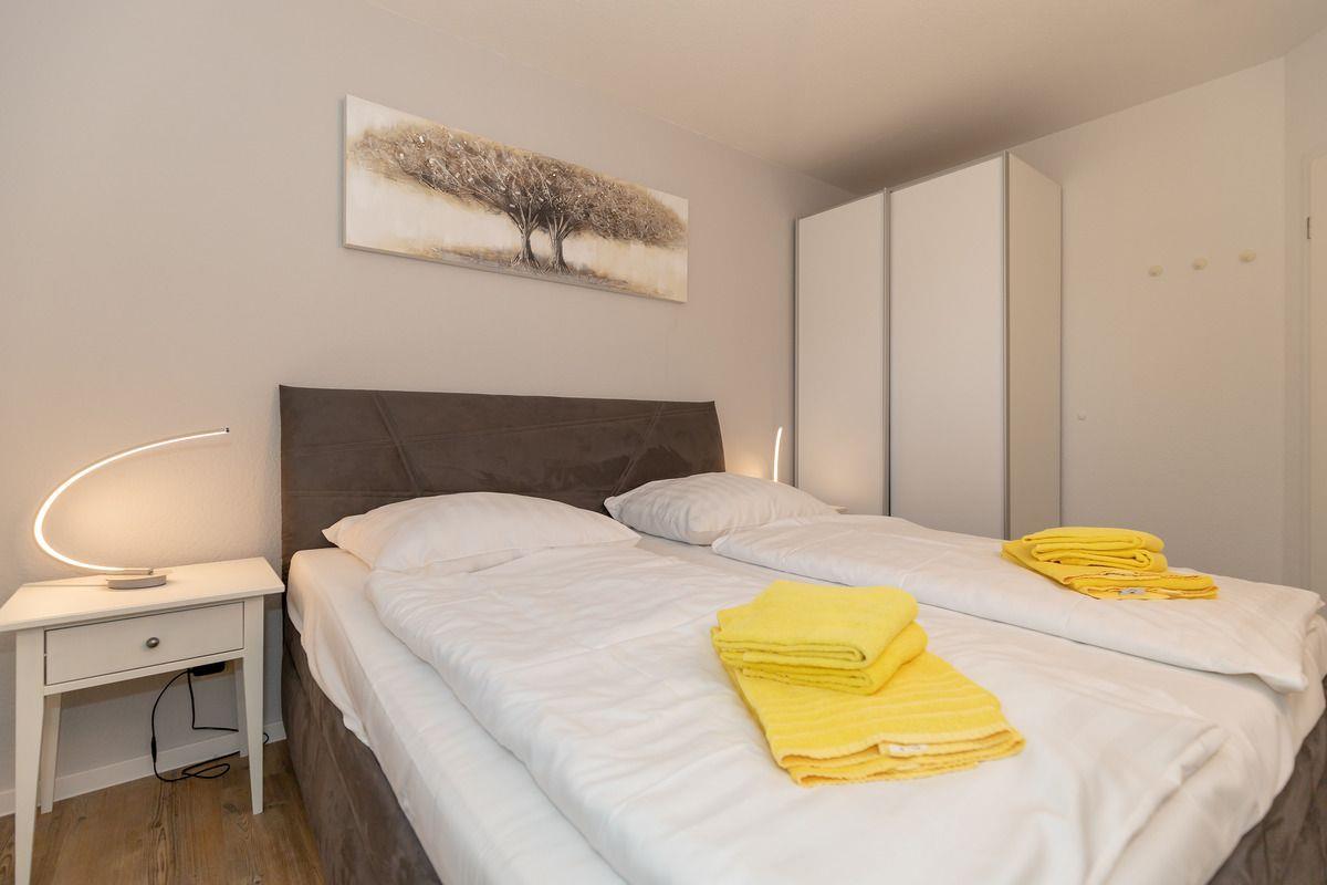 Das gemütliche 1. Schlafzimmer ist mit einem bequemen Boxspring-Doppelbett (2 x 90 cm x 200 cm), Nachttischen mit Nachttischlampen sowie einem geräumigen Kleiderschrank eingerichtet.