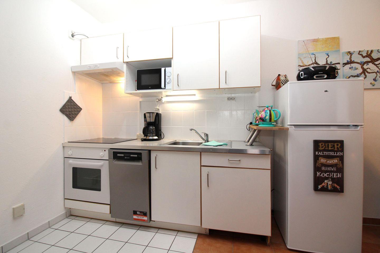 Der offene Küchenbereich beinhaltet eine voll ausgestattete Einbauküchenzeile mit 4-Zonen- Ceran-Kochfeld, Backofen, Dunstabzug, Mikrowelle, Kühlschrank mit Gefrierfach, Geschirrspülmaschine, Kaffeemaschine, Wasserkocher und Toaster. Die Küche ist mit Geschirr, Gläsern, Besteck und Töpfen komplett ausgestattet.