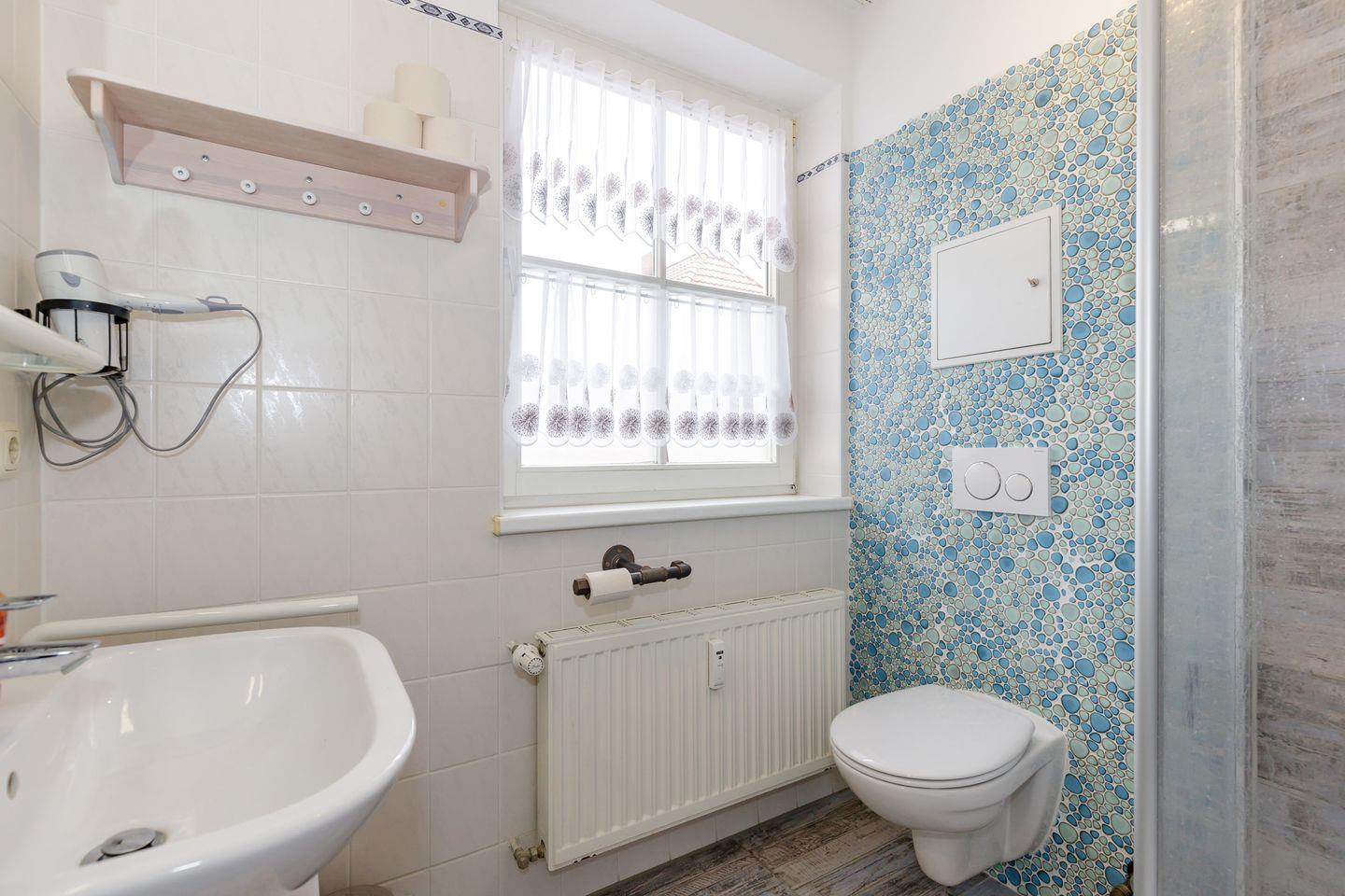 Das helle Badezimmer (mit Tageslicht / Fenster) verfügt über eine Dusche, Waschbecken mit Unterschrank, WC, Föhn sowie ausreichend Ablagemöglichkeiten.