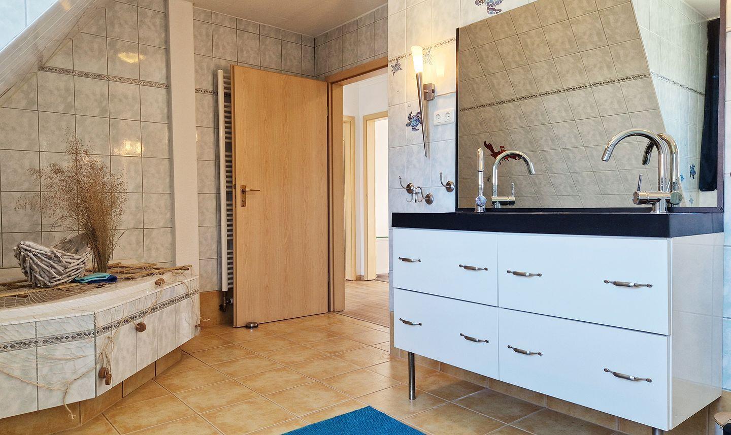 Das Badezimmer ist ein großes Duschbad mit Doppelwaschbecken und WC. Die Eckebadewanne ist nur zur Dekoration und nicht für eine Nutzung vorgesehen.