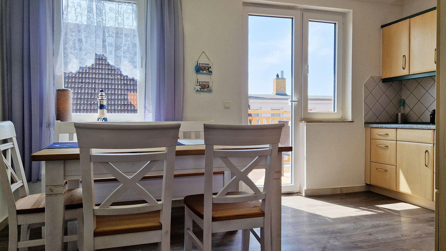 Das Wohnzimmer ist großzügig, verfügt über TV und eine gemütliche Sofaecke. Hier ist auch der Zugang zum großen Westbalkon mit dem man einen herrlichen Blick über Kühlungsborn hat und die Abendsonne bis in die späten Abendstunden genießen kann.