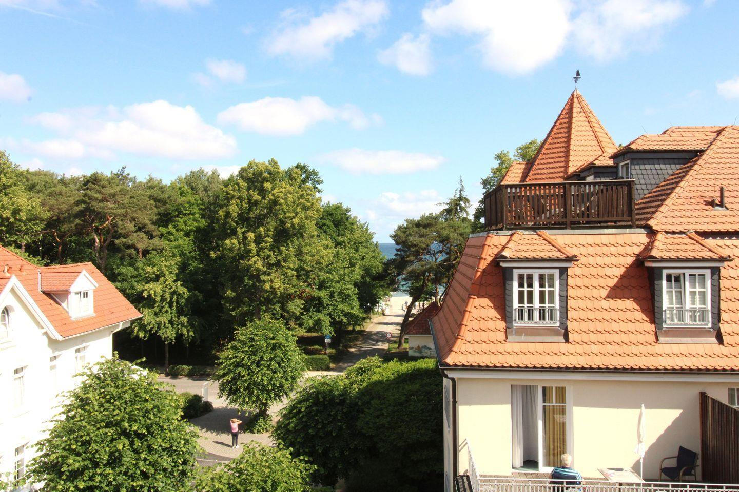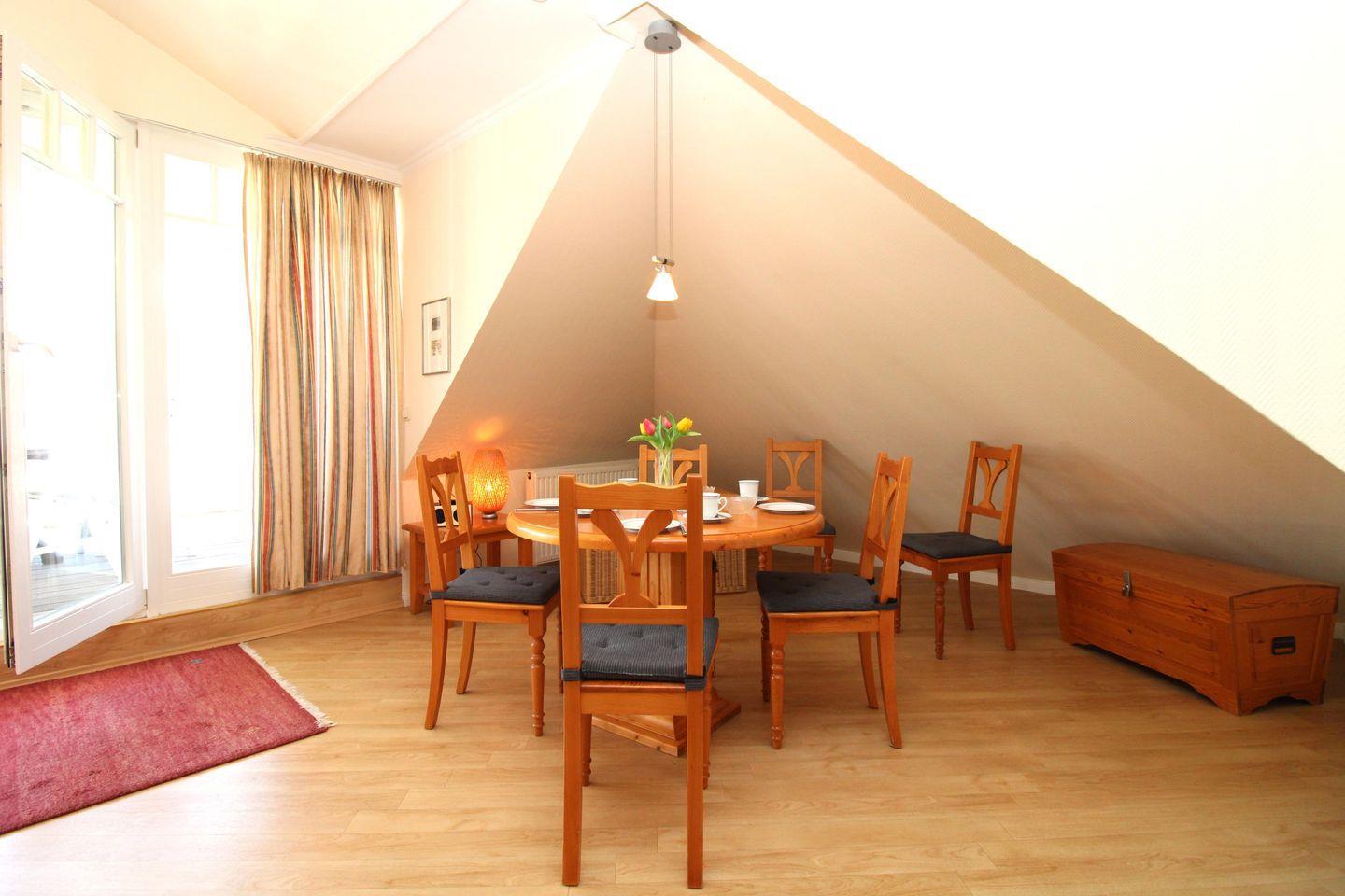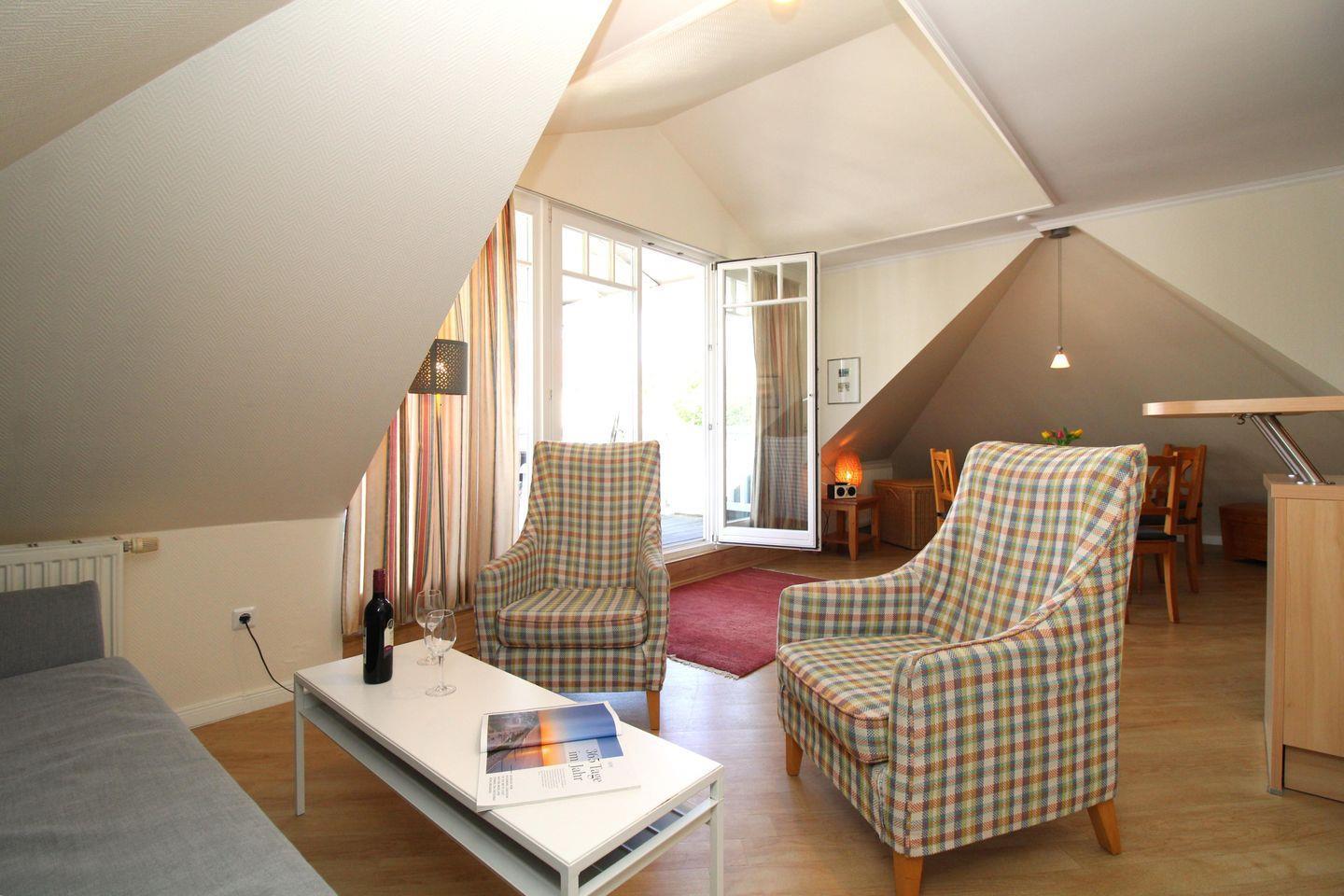Das geräumige und gemütliche Wohn-/Esszimmer verfügt über eine Sitzgruppe mit bequemer (ausziehbarer Schlaf-) Couch, 2 Sesseln und Couchtisch sowie einen separaten Esstisch mit 6 Stühlen. Vom Wohnzimmer aus haben Sie direkten Zugang zu dem großen (ca. 13 m²) überdachten Balkon (nach Süden, Westen und Norden ausgerichtet) mit Balkonmöbeln, einer Sonnenliege und seitlichem Meerblick - hier sitzen Sie entspannt und gemütlich mitten im Grünen und können bei einem guten Glas Wein die lauen Sommernächte über den Dächern von Kühlungsborn genießen …!