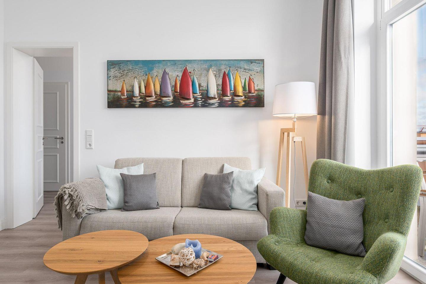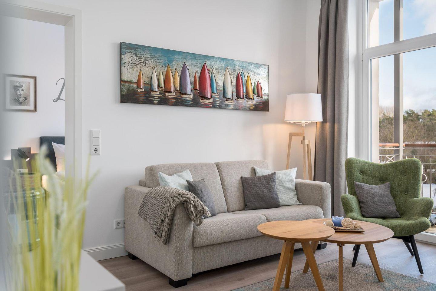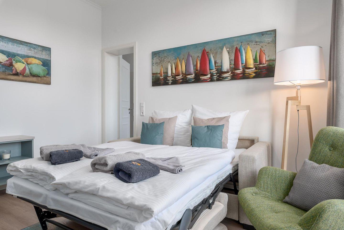 Im Wohnbereich finden Sie ein großes Sofa zum Entspannen, das schnell zum