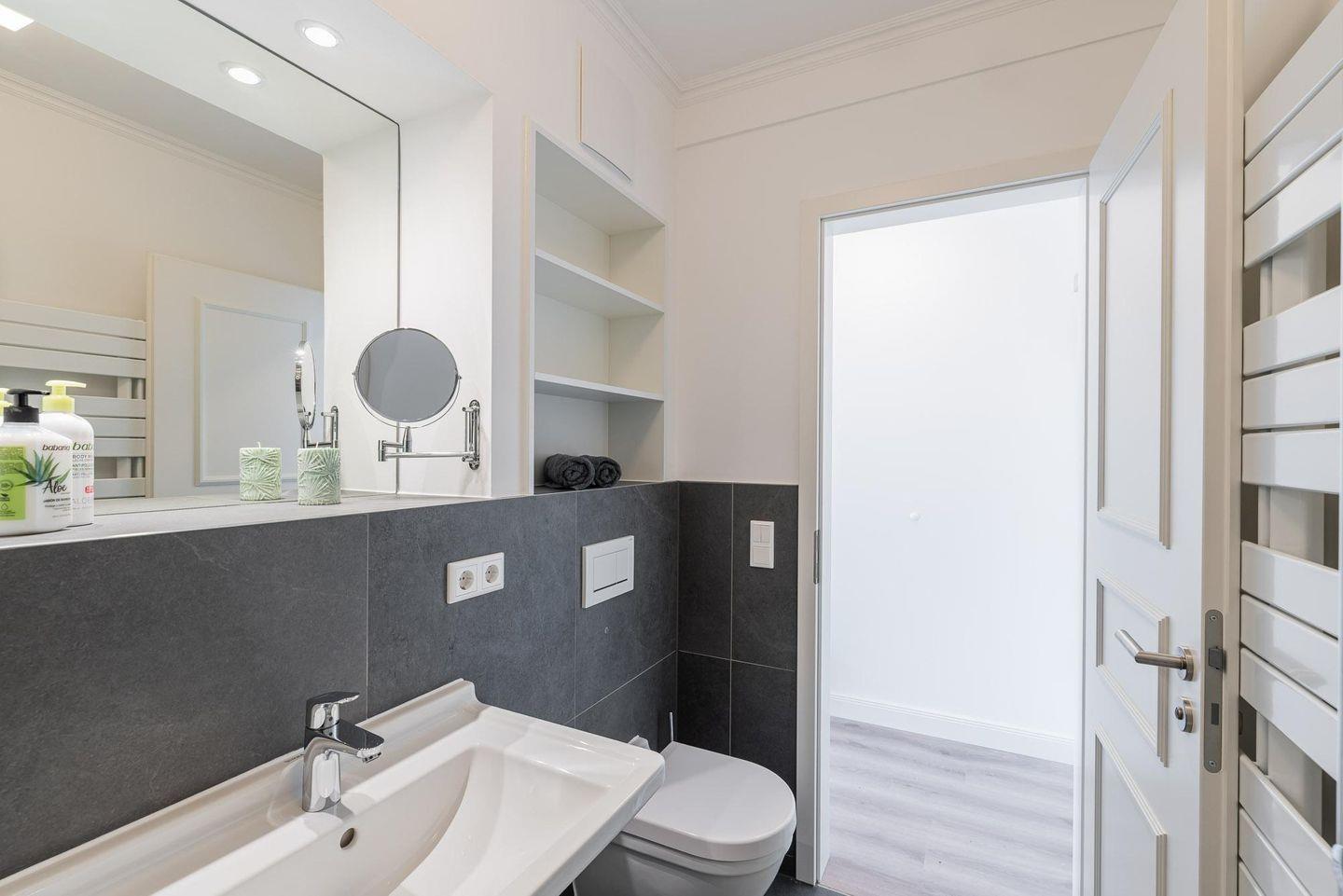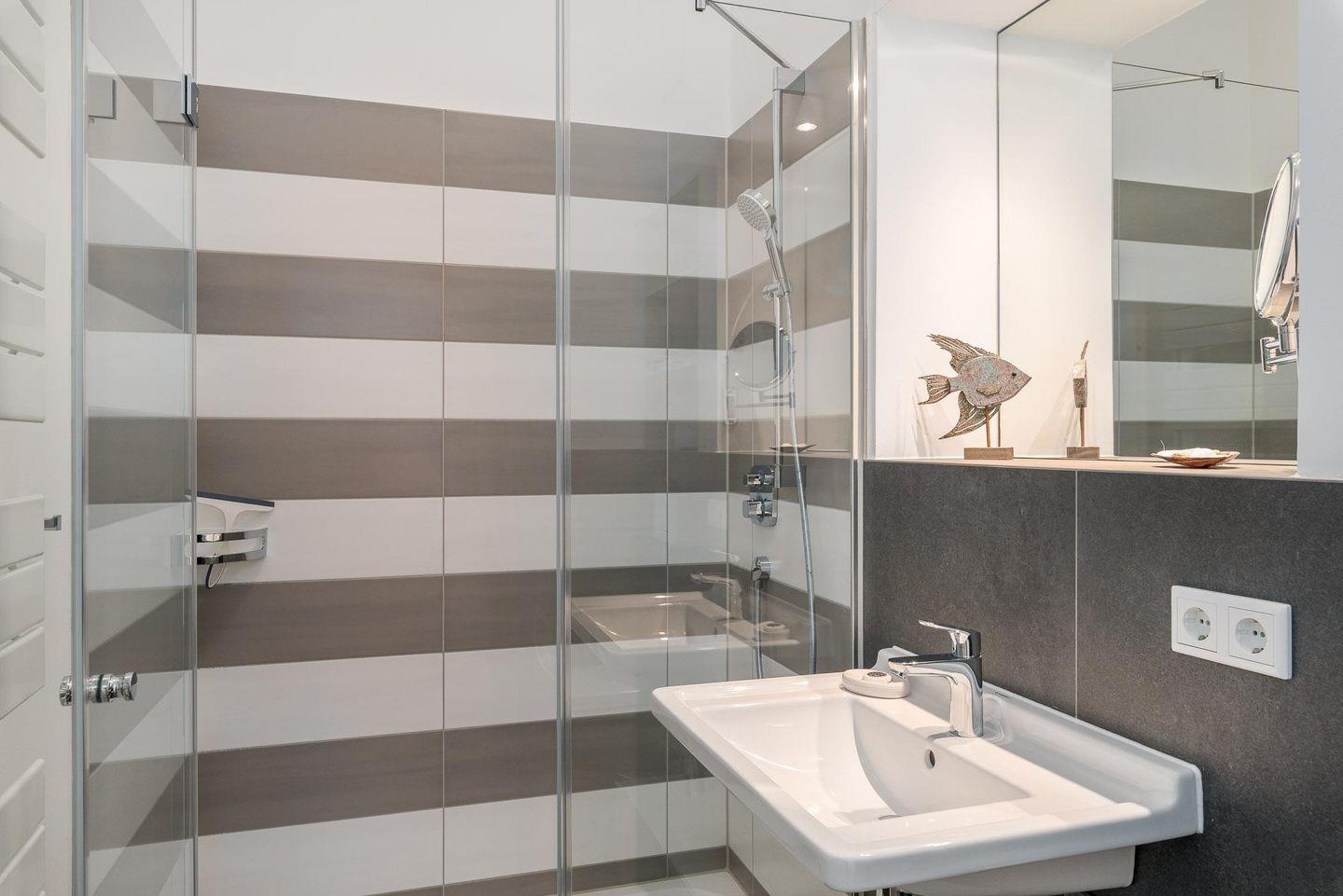 Das elegante Duschbad hat eine große fast bodengleiche Dusche, WC,