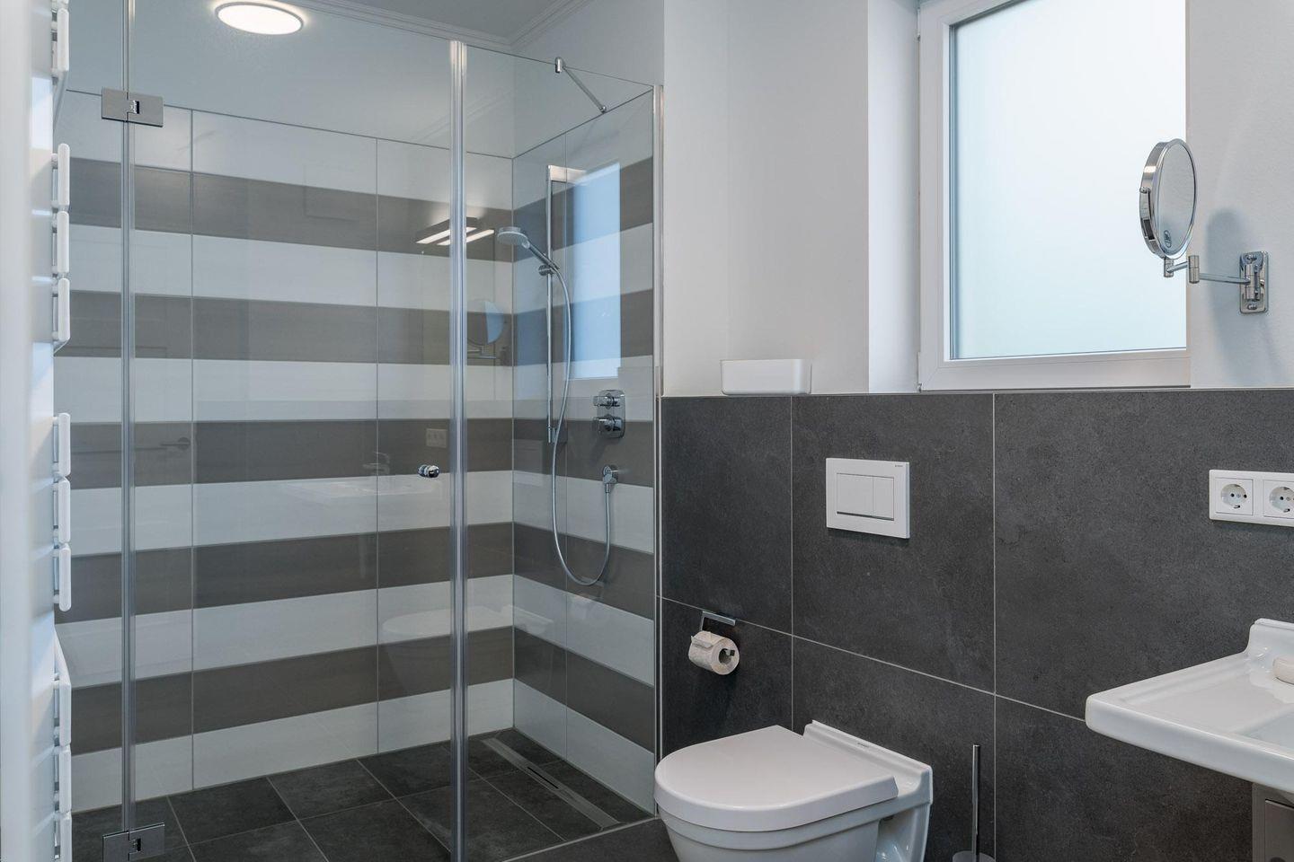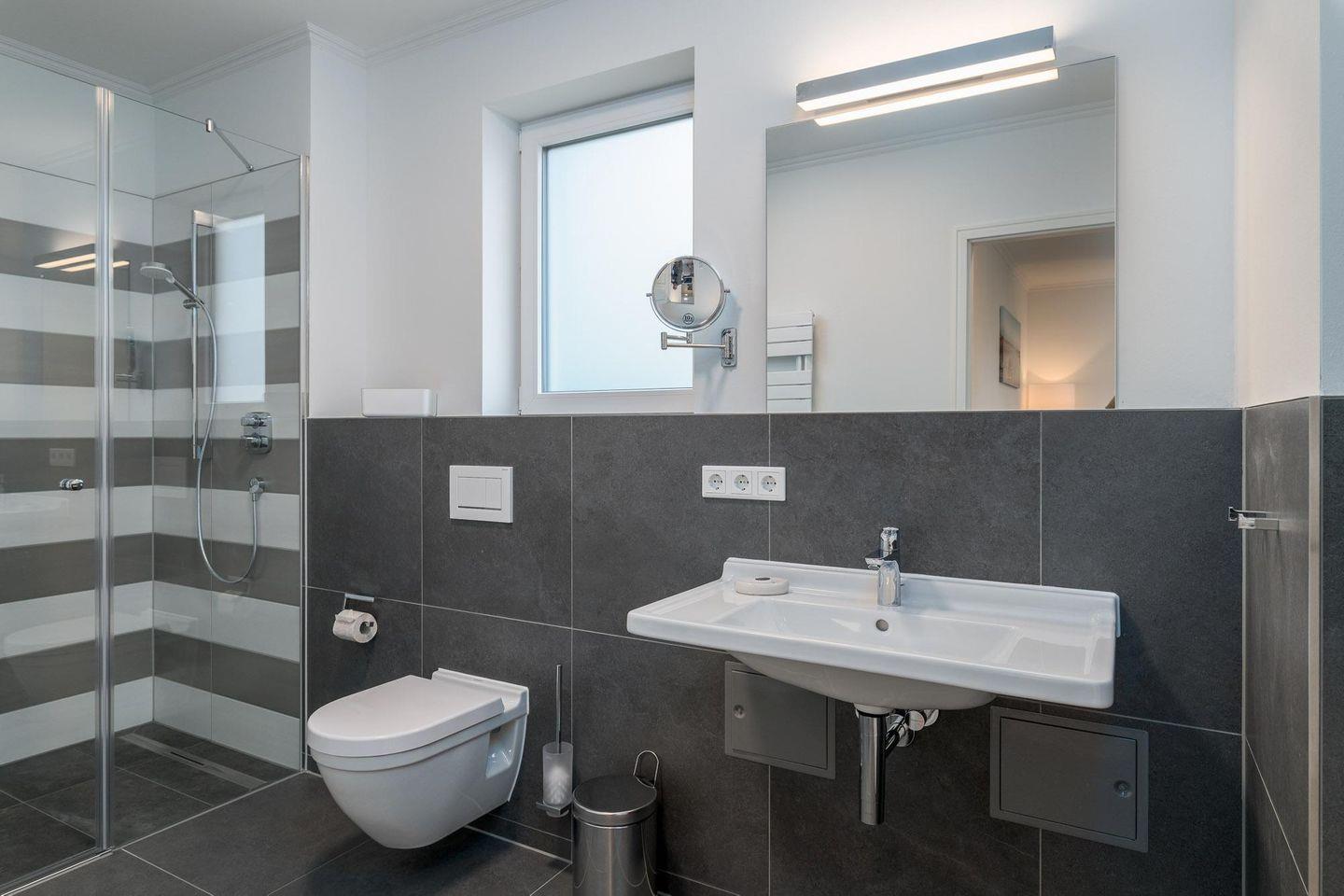 Das Bad verfügt über eine Dusche, einem Haartrockner und einem Handtuchtrockner.
