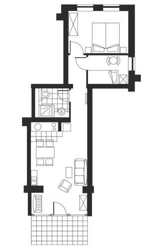 Die Wohnung bietet auf 45 qm genügend Platz für vier Personen und verfügt über