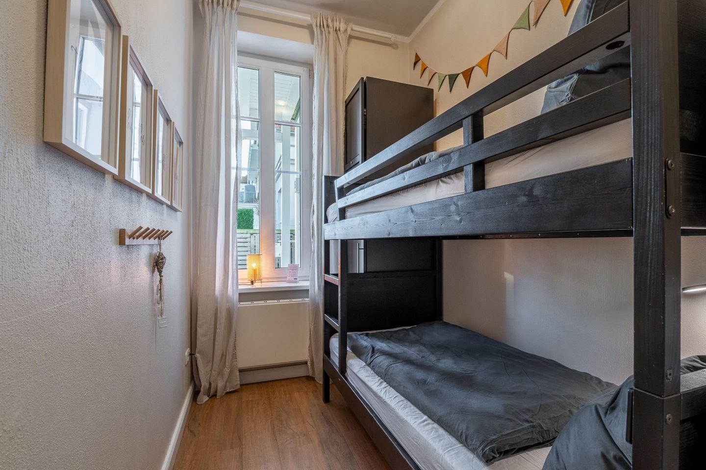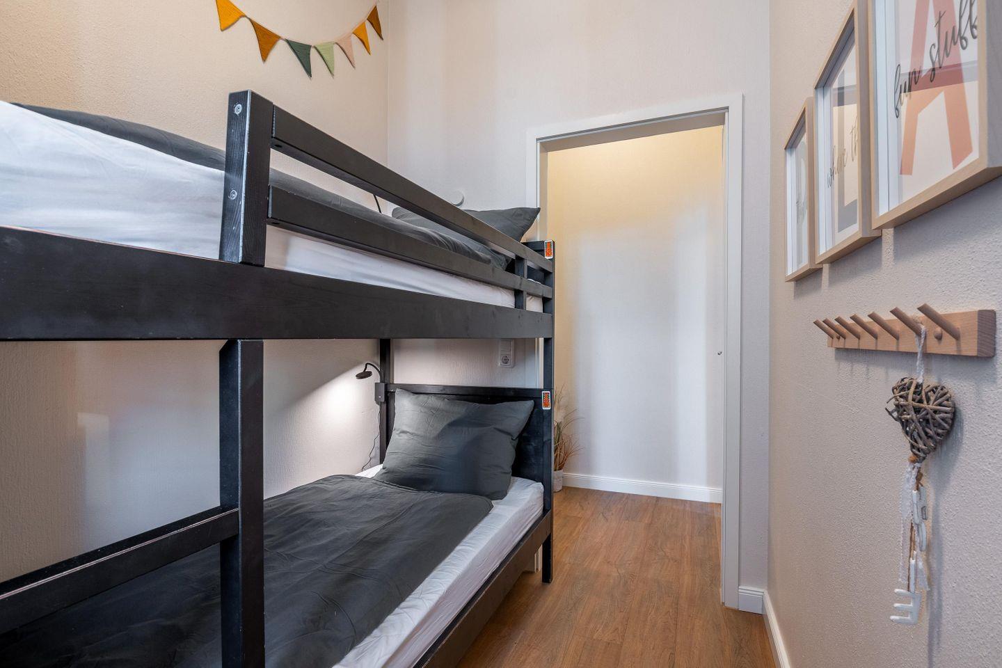 ein Schlafzimmer mit Doppelbett und ein kleines Kinderzimmer mit Etagenbett.
