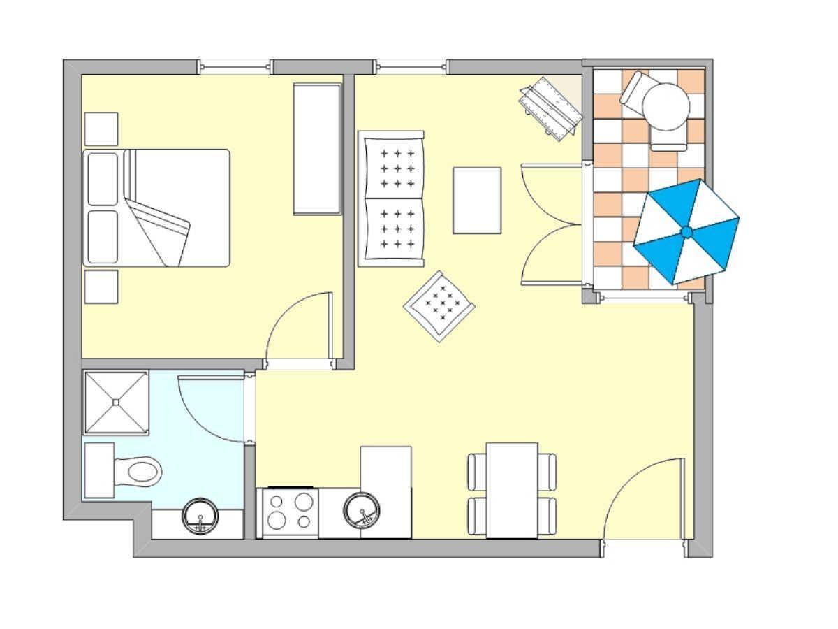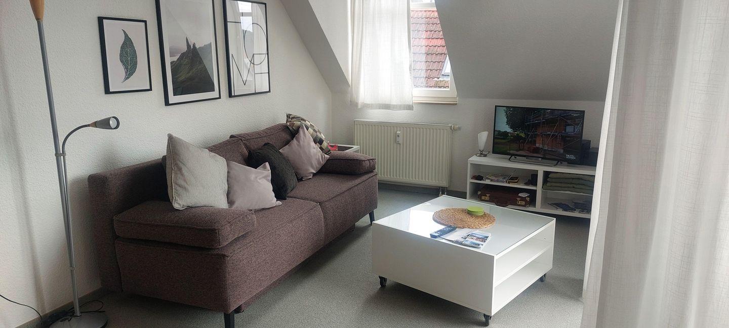 Im gemütlichen Wohnbereich laden ein bequemes Sofa, ein Sessel und ein Fernseher zum Entspannen ein. Die offene Küchenzeile ist praktisch ausgestattet mit einem Herd inklusive Backofen sowie einem Kühlschrank – perfekt für selbstgekochte Lieblingsgerichte oder ein gemütliches Frühstück auf dem Balkon.