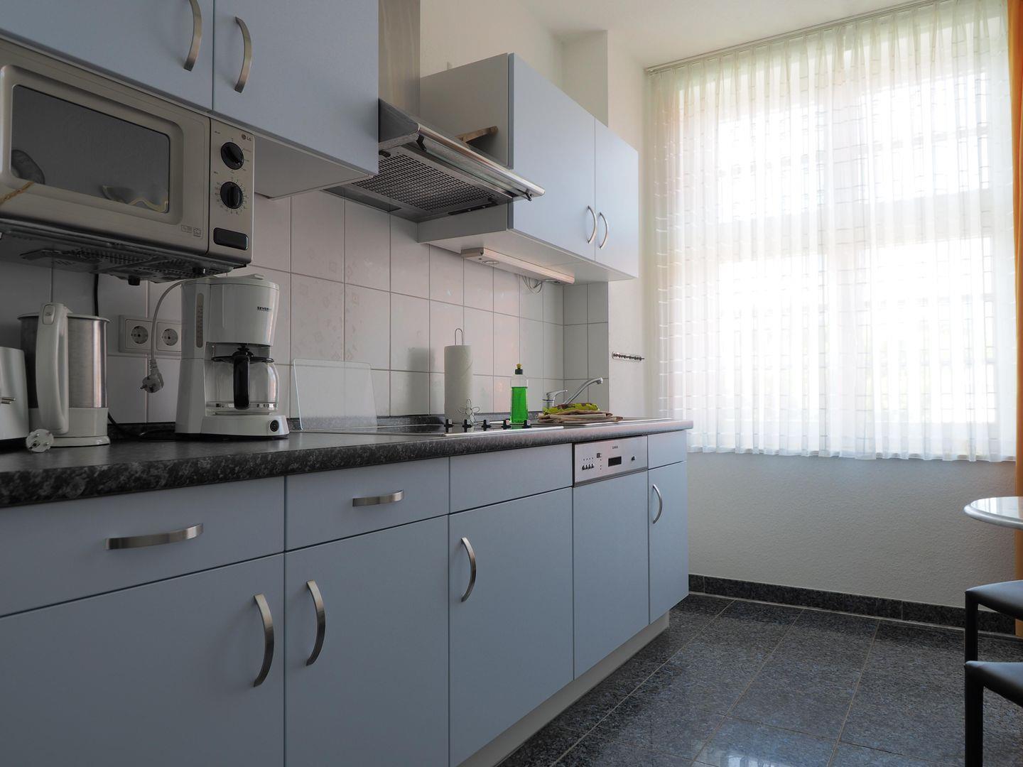 Die offene, voll ausgestattete Küche macht das Kochen im Urlaub zum Vergnügen: Ceranfeld, Spülmaschine, Mikrowelle, Kühlschrank mit Gefrierfach, zahlreiche Küchengeräte und reichlich Geschirr lassen keine Wünsche offen. Zusätzlich sorgt ein kleiner Frühstücksbereich mit Bistrotisch und Stühlen für den perfekten Start in den Tag.