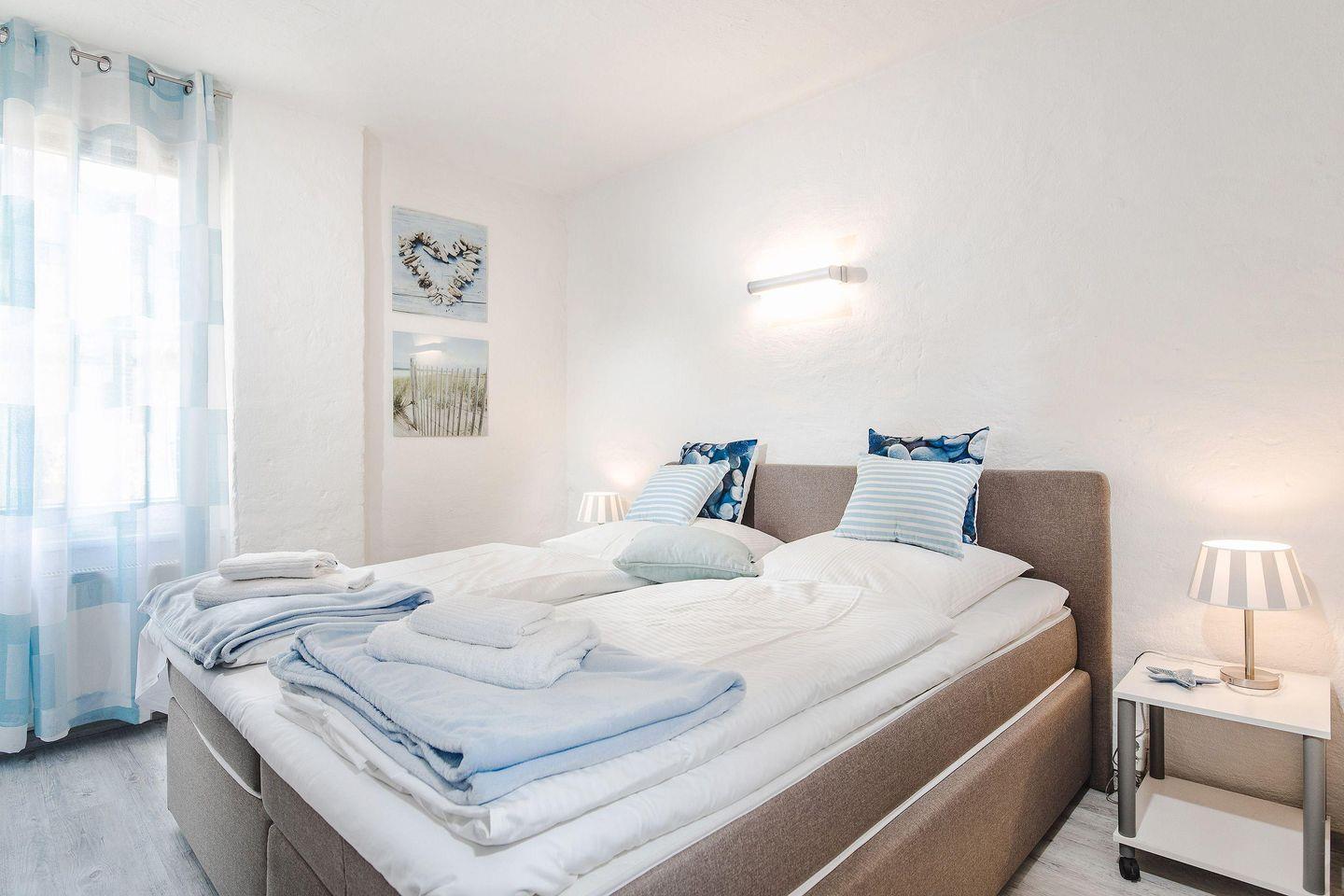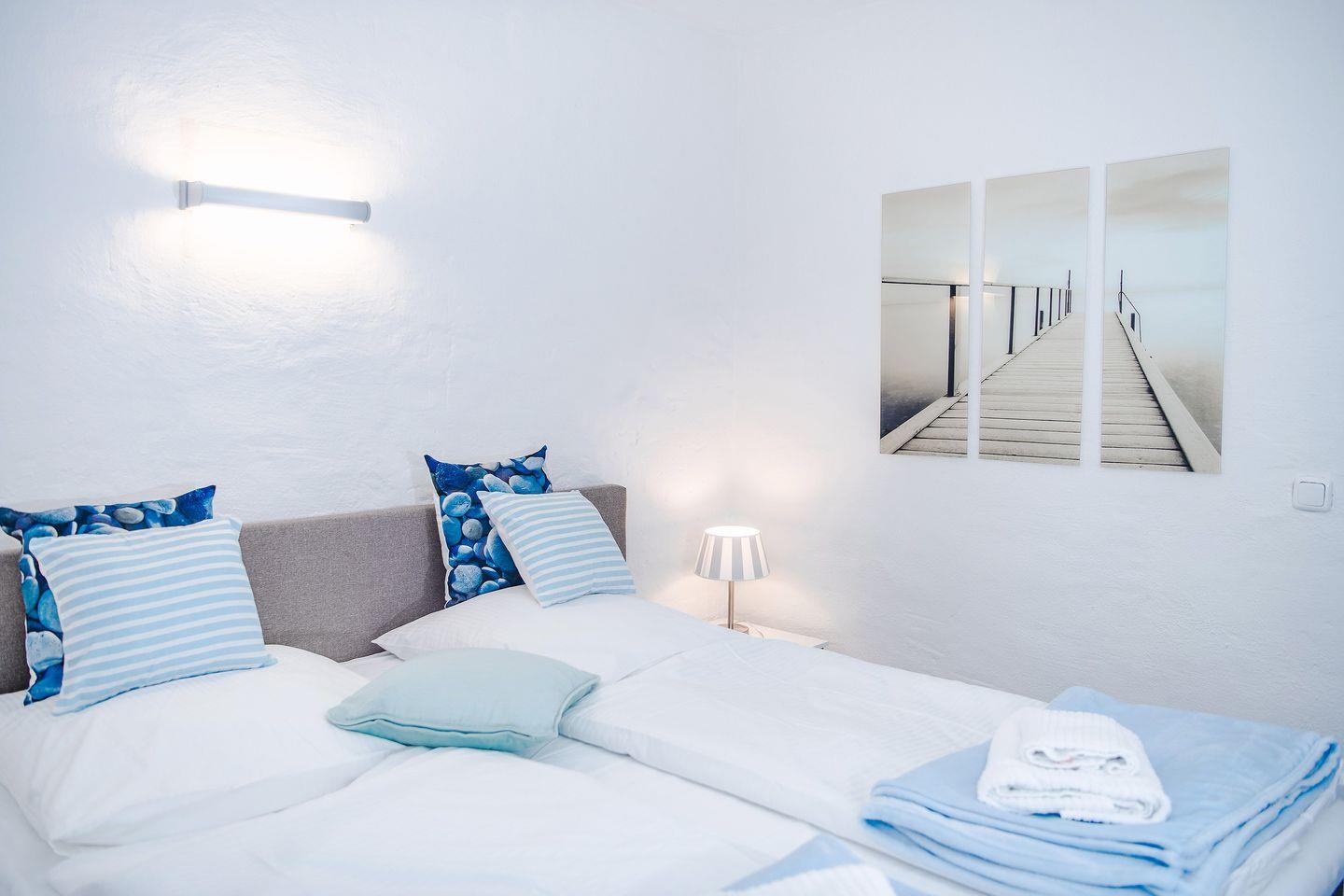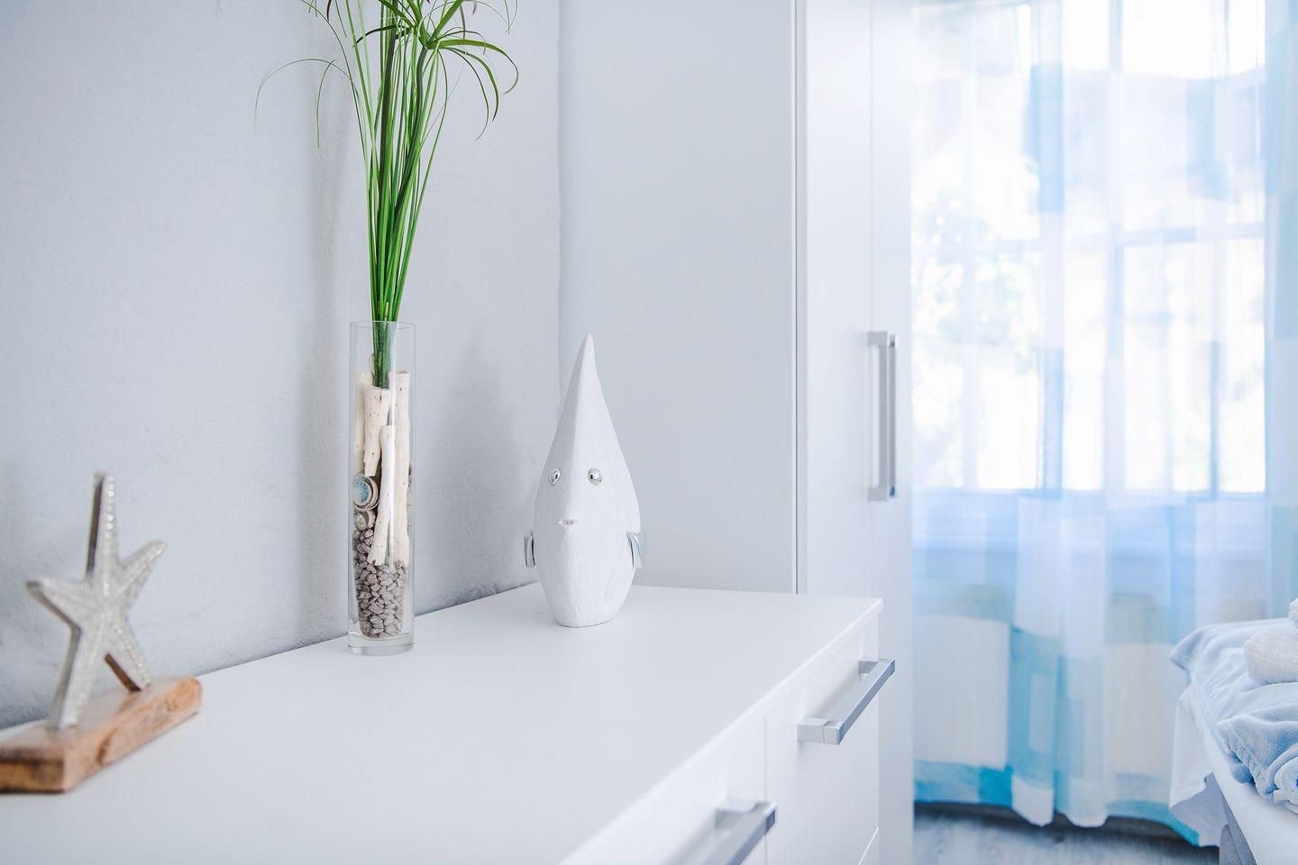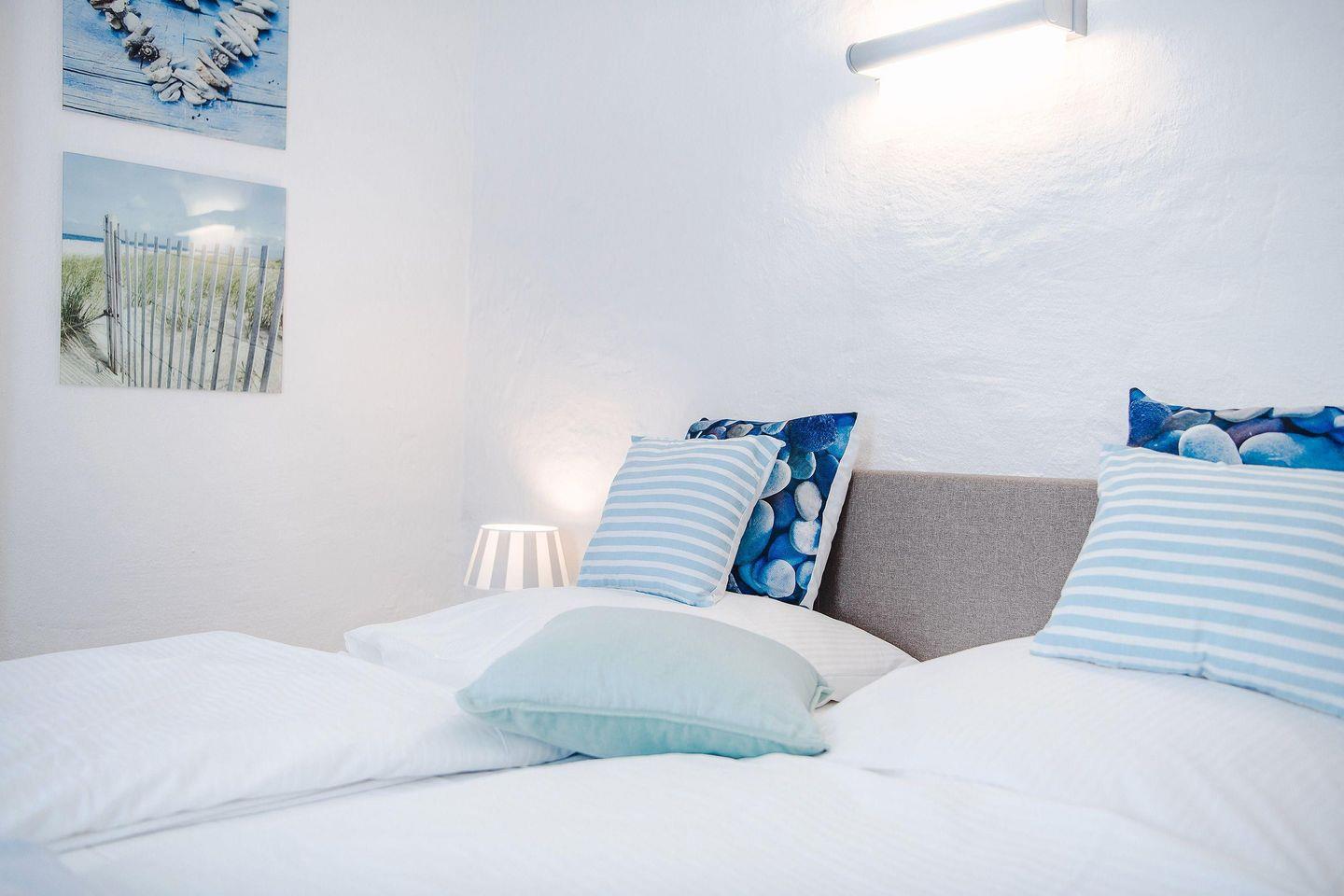 Die Fewo betreten Sie im Obergeschoss und gelangen direkt in den offenen Wohn- und Küchenbereich. Die Pantry bietet einen Ceranfeld-Herd, Kühlschrank, Mikrowelle, Kaffeemaschine, Toaster und Wasserkocher. Durch den Küchenbereich betreten Sie den Balkon mit Gartenmöbeln. Über die Spindeltreppe erreichen Sie das Erdgeschoss mit dem Duschbad und das liebevoll eingerichtete Schlafzimmer mit einem großen Boxspringbett.