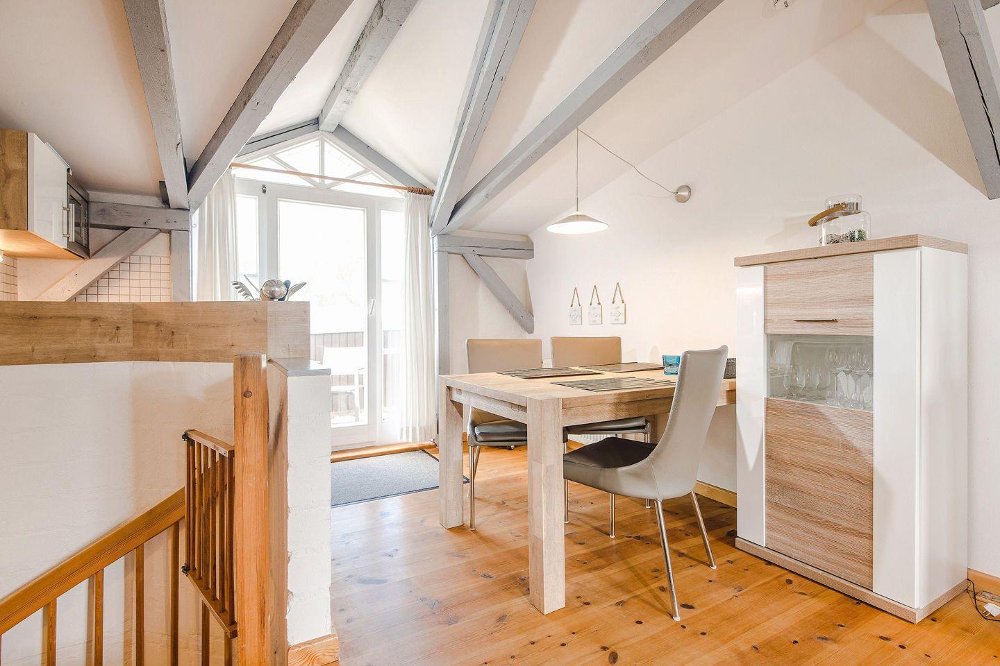 Die Wohnung selbst liegt im Obergeschoss und empfängt Sie mit einem offenen, hellen Wohn- und Küchenbereich. Sie bietet Platz für drei Personen und einen Hund. Die moderne Küche ist komplett ausgestattet mit 2 Platten Ceranfeld-Herd, Kühlschrank, Mikrowelle, Kaffeemaschine, Toaster und Wasserkocher – perfekt für ein gemeinsames Frühstück oder ein entspanntes Abendessen. Vom Wohnbereich aus gelangen Sie direkt auf den Balkon, der mit Gartenmöbeln zum Verweilen einlädt – ob mit einer Tasse Kaffee am Morgen oder einem Glas Wein am Abend.