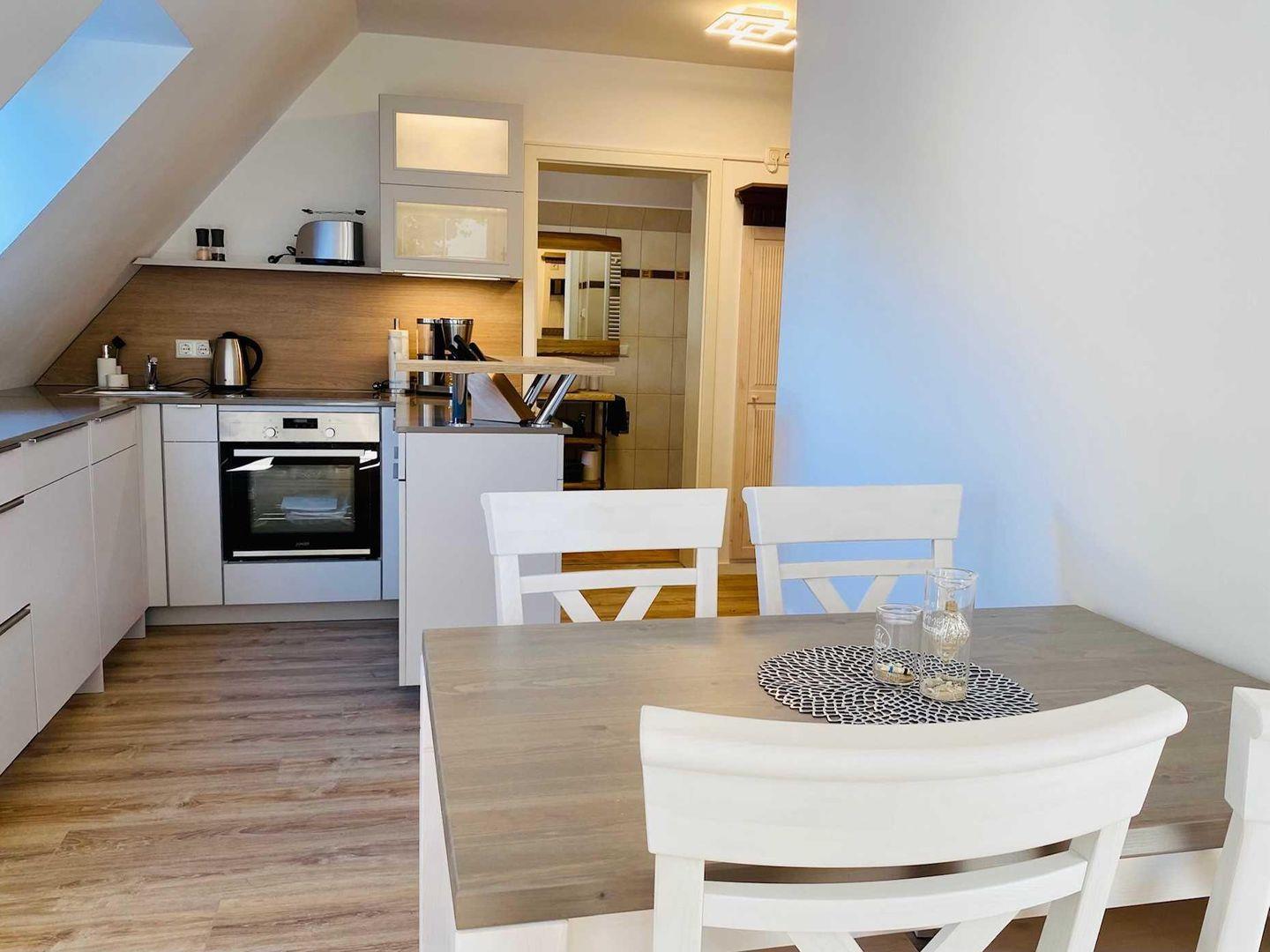 Der offene Wohn- und Essbereich lädt zum Wohlfühlen ein – mit einem gemütlichen Sofa (ausziehbar für eine dritte Person), einem Esstisch sowie einer voll ausgestatteten Küche, in der Sie nach Lust und Laune kochen können.