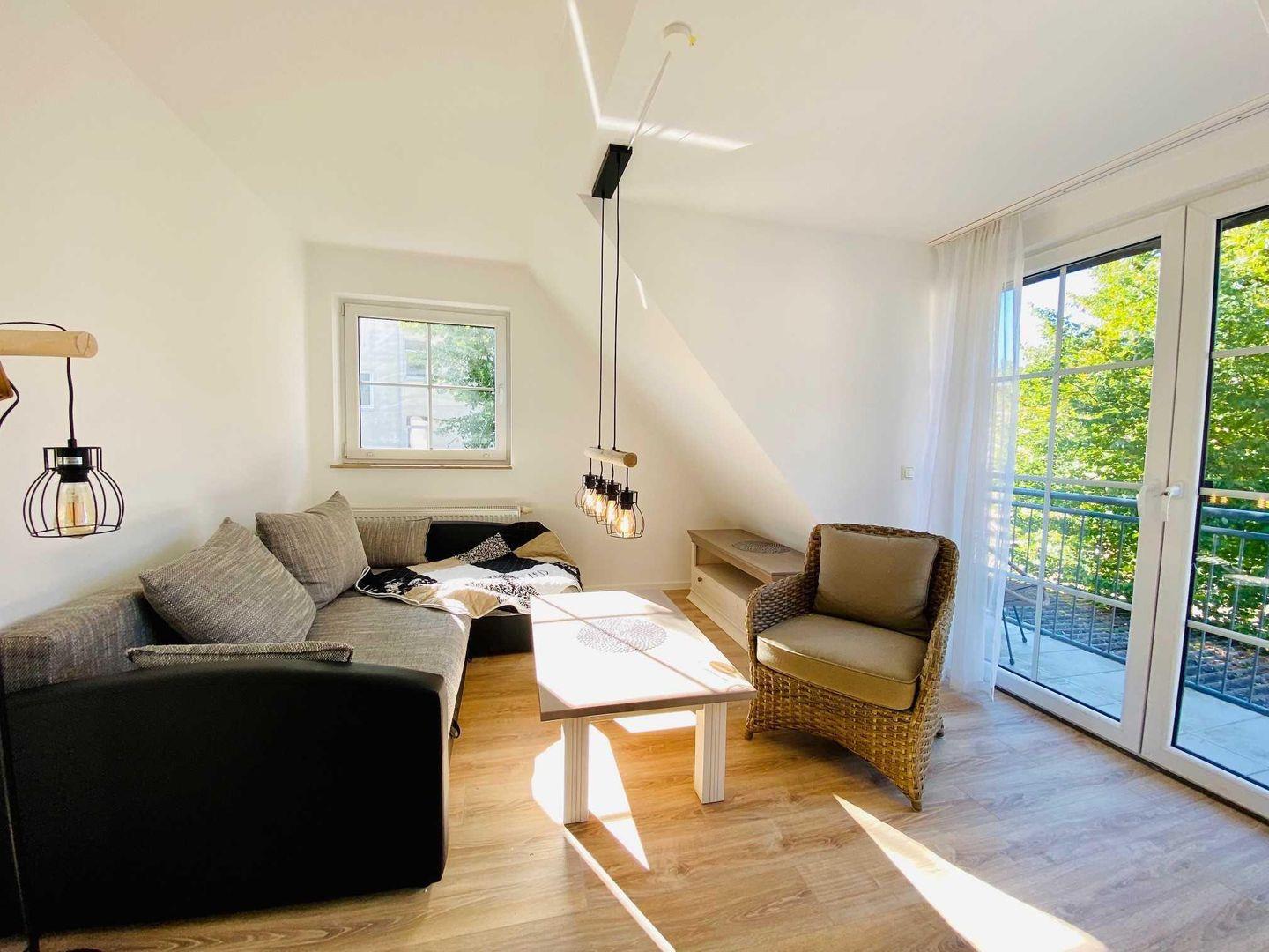 Auf 52?m² Wohnfläche im 1. Obergeschoss eines gepflegten Apartmenthauses erwartet Sie eine stilvoll eingerichtete Unterkunft für bis zu 3 Personen. Das separate Schlafzimmer mit Doppelbett und Kleiderschrank sorgt für erholsame Nächte. Im modernen Badezimmer stehen Ihnen Dusche, Waschtisch und WC zur Verfügung.