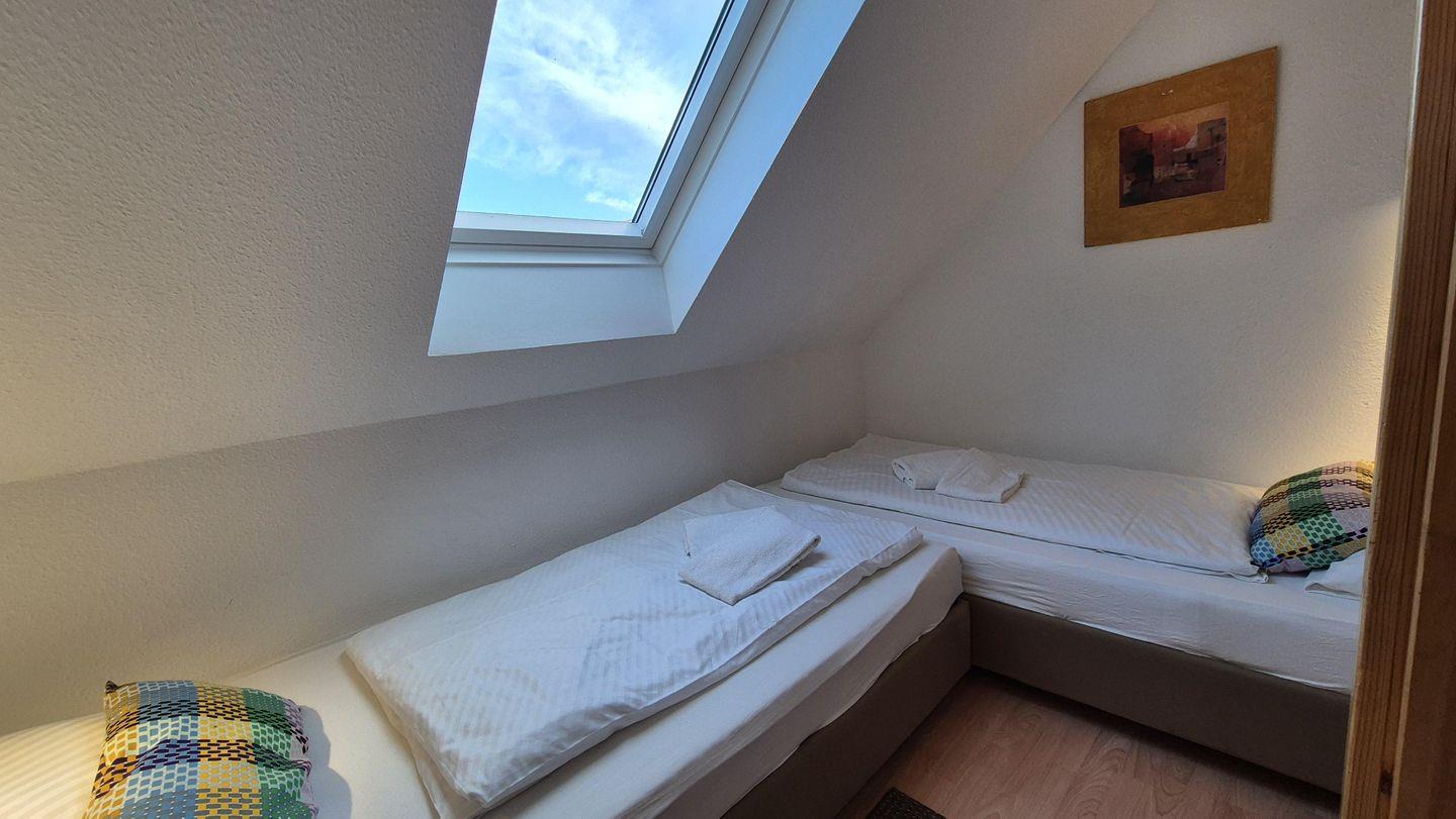 Im Obergeschoss erwarten Sie ein Schlafzimmer mit gemütlichem Doppelbett und praktischem Kleiderschrank sowie ein weiteres Zimmer mit zwei Einzelbetten – perfekt für die Kinder. Für schöne Stunden im Freien steht Ihnen eine Terrasse zur Verfügung, auf der Sie den Tag entspannt ausklingen lassen können.