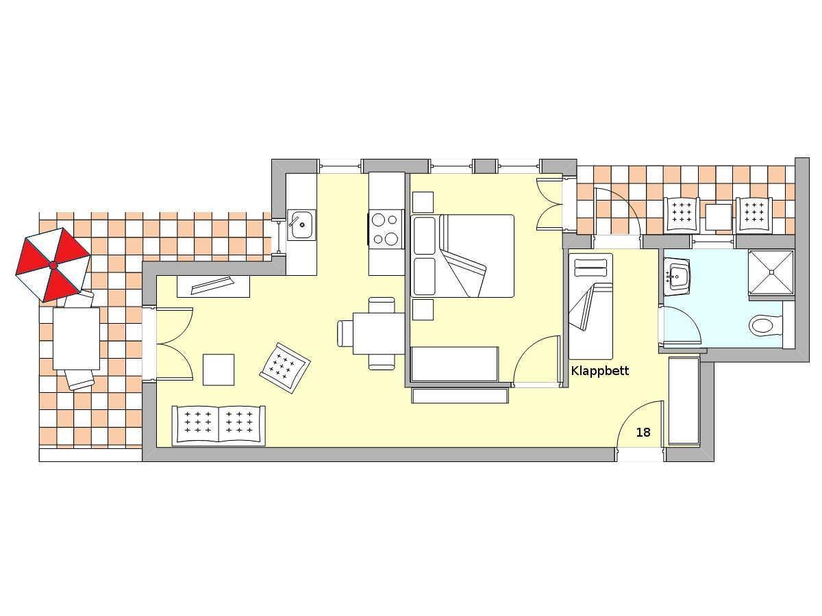 Moderne 59?m²-Ferienwohnung für bis zu 3 Personen mit einem Schlafzimmer (Doppelbett), zusätzlichem Schrankbett im Flur, Duschbad und zwei Balkonen. Heller Wohnbereich mit Sofa, Sessel, TV, Esstisch mit Rattanstühlen und voll ausgestatteter Küche. Ideal für Paare oder kleine Familien – stilvoll, gemütlich und durchdacht eingerichtet.