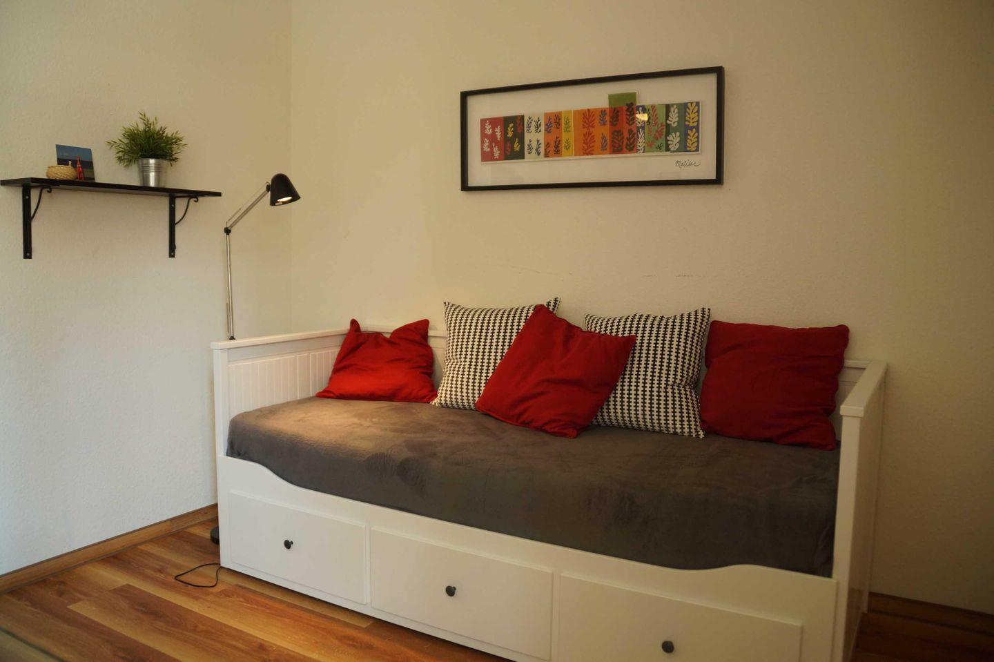 Das helle Wohnzimmer ist der gemütliche Mittelpunkt der Wohnung: Eine komfortable Sitzecke lädt zum Entspannen ein, während das moderne Sideboard und das TV-Gerät für Unterhaltung sorgen. Die integrierte Küchenzeile lässt keine Wünsche offen – ausgestattet mit 4-Felder-Cerankochfeld, Geschirrspüler, Mikrowelle, Kaffeemaschine, Wasserkocher und allem, was Sie für gemeinsame Kochmomente benötigen. Für eine fünfte Person kann der Wohnbereich bequem aufgebettet werden.