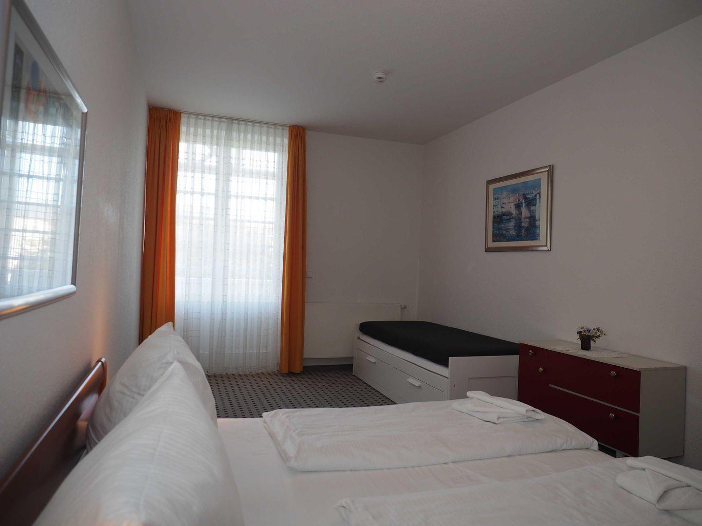 Das sehr großzügige Schlafzimmer bietet ideale Schlafmöglichkeiten für bis zu drei Personen – ausgestattet mit einem komfortablen Doppelbett und einem Einzelbett, dazu ein großer Kleiderschrank für reichlich Stauraum.