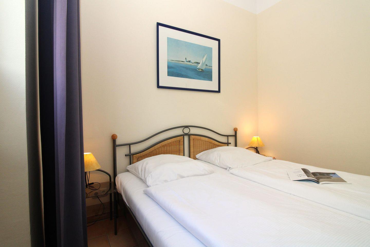 Das freundliche Schlafzimmer ist mit einem bequemen Doppelbett (2 x 90 cm x 200 cm), Nachttischen mit Nachttischlampen, einem geräumigen Kleiderschrank sowie einem Kleiderständer eingerichtet.