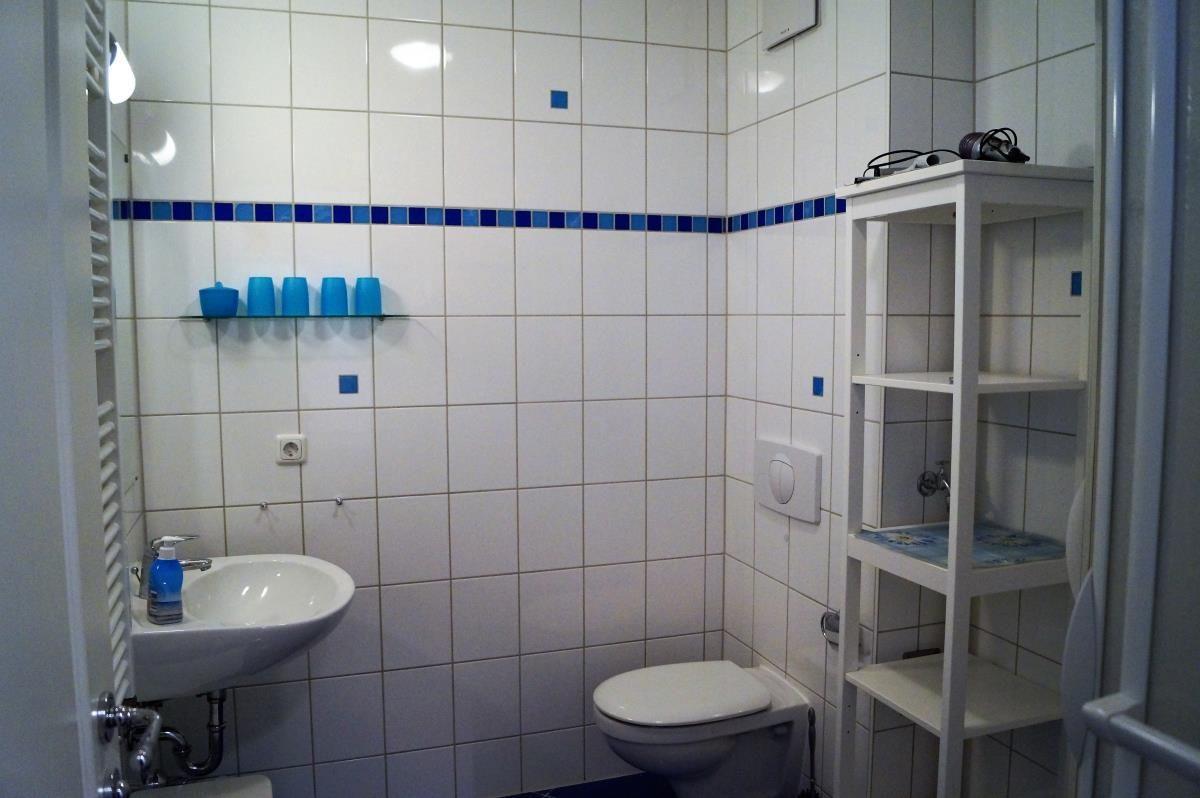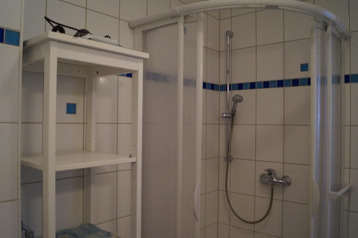 Zu der Wohnung gehört noch ein Badezimmer mit Dusche und WC. Auch ein Fön ist vorhanden.