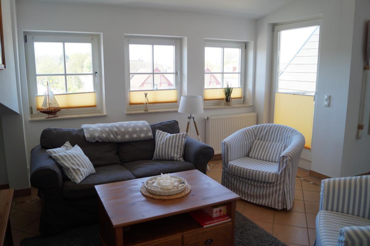Über den Dächern von Kühlungsborn.... genießen Sie einen schönen Blick vom Balkon der geräumigen, fast 60m² großen Ferienwohnung in Kühlungsborn-West. In kurzer Strandentfernung und unweit des Stadtwaldes gelegen, gilt dieses Feriendomizil als idealer Ausgangspunkt für Ihren Ostsee-Urlaub. Im zweiten Obergeschoss des Hauses (kein Fahrstuhl) befindet sich die liebevoll und mit vielen maritimen Accessoires ausgestattete Ferienwohnung. Hinter dem Haus steht ein der Wohnung direkt zugeordneter Parkplatz zur Verfügung. Fahrräder können im hauseigenen Fahrradkeller sicher und trocken untergestellt werden.