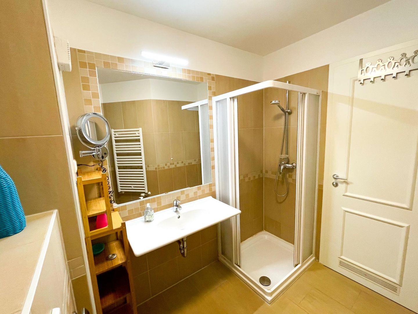 Neben vielen Ablagemöglichkeiten verfügt das Bad über eine Dusche mit tiefem Einstieg, über ein Waschbecken und ein WC. Es gibt einen Handtuchhalter-Heizkörper, einen Kosmetikspiegel sowie einen Fön.