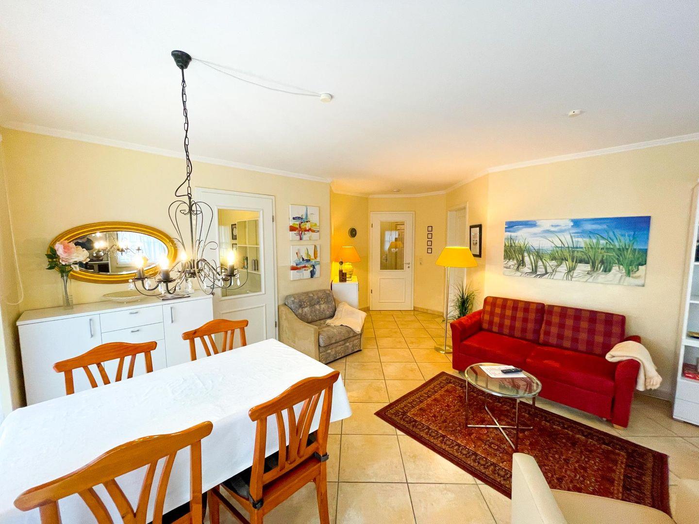 Direkt im Herzen von Kühlungsborn-West befindet sich die kleine gepflegte Apartmentanlage "Uns Strandhus". Im typischen Stil der Bäderarchitektur errichtet strahlt dieses schöne Haus mit seinen sonnigen Farben Urlaubsatmosphäre der ganz besonderen Art aus. Eine gepflegte Gartenanlage sowie eine Liegefläche mit viel Grün runden das Erscheinungsbild des Hauses ab. Die Ferienwohnung liegt im Erdgeschoss des Hauses und verfügt über eine schöne Terrasse mit Strandkorb. Auf einer Wohnfläche von ca. 50m² verteilt gibt es ein separates Schlafzimmer, ein Wohnraum mit Sitz- und Essecke sowie integrierter Küchenzeile und ein schönes Badezimmer. Die Wohnung ist für maximal vier Personen geeignet. Die Gäste können den vorhandenen WLAN-Anschluss gebührenfrei nutzen. Das Auto kann in der hauseigenen Tiefgarage abstellt werden, ebenso mitgebrachte oder gemietete Fahrräder.