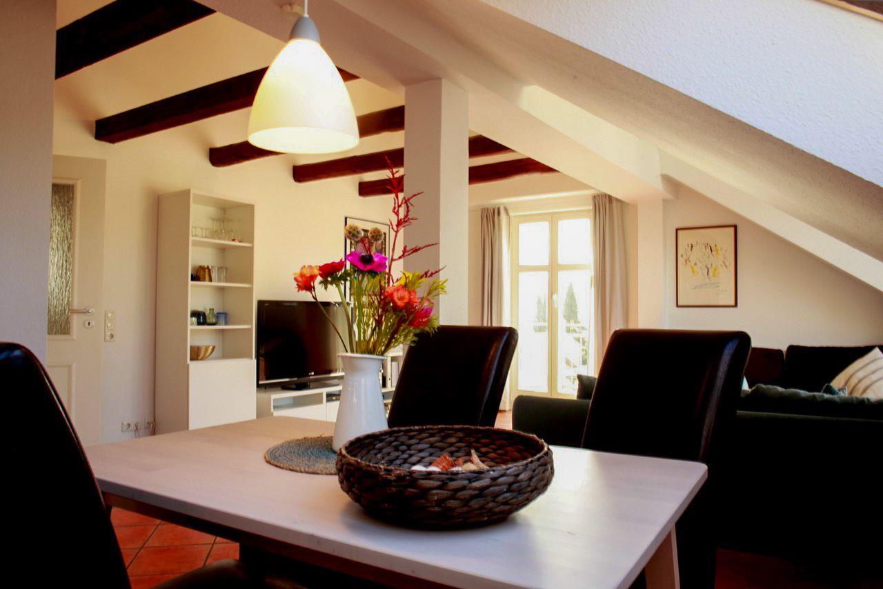 Der Wohnbereich der Ferienwohnung lädt mit zwei Sofas zu geselligen Abenden ein. Zur Unterhaltung stehen ein Flachbild-TV und eine Stereoanlage für Sie bereit. Der angrenzende Essbereich bietet 4 Personen viel Platz für gemütliche Mahlzeiten. Die offene und freundlich helle Küche der Ferienwohnung verfügt über einen 4-Platten-Herd mit Backofen und einem Kühlschrank. Ein Toaster, eine Kaffeemaschine sowie ein Wasserkocher komplettieren die Ausstattung der Küche.