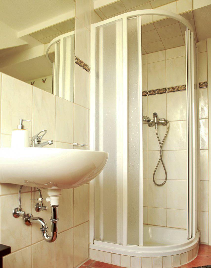 Das Tageslichtbadezimmer befindet sich direkt neben dem Schlafzimmer. Ein Waschbecken mit großem Spiegel und einem Kosmetikspiegel gehören ebenso zur weiteren Einrichtung des Bades wie ein kleines Regal für Ihre Waschutensilien.