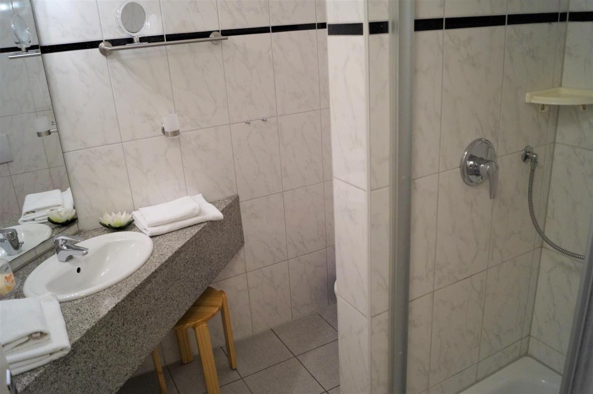 Das komfortable Bad hat eine Dusche, ein Waschbecken und ein WC. Es gibt natürlich auch einen Hand-Fön.