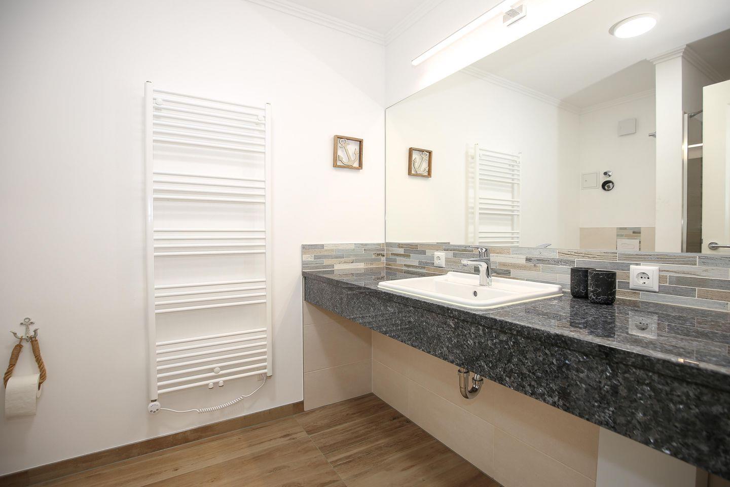 Das Tageslichtbad mit ebenerdiger Dusche ist mit einem großzügigen Waschtisch und einem Föhn ausgestattet.