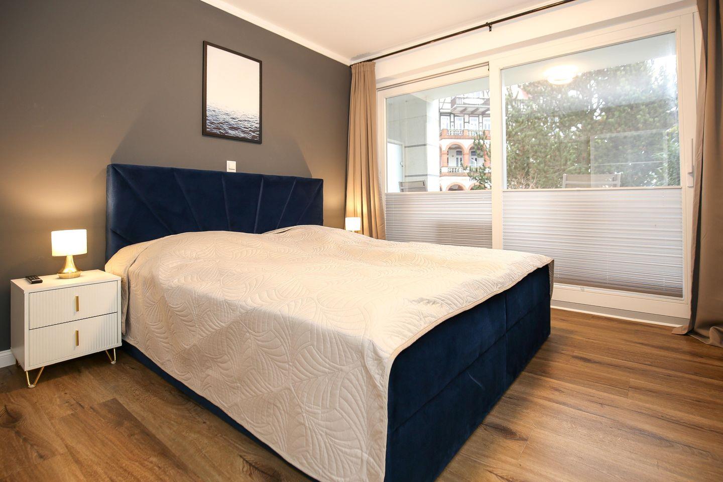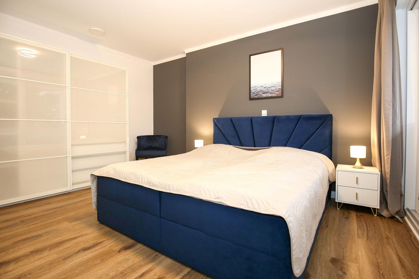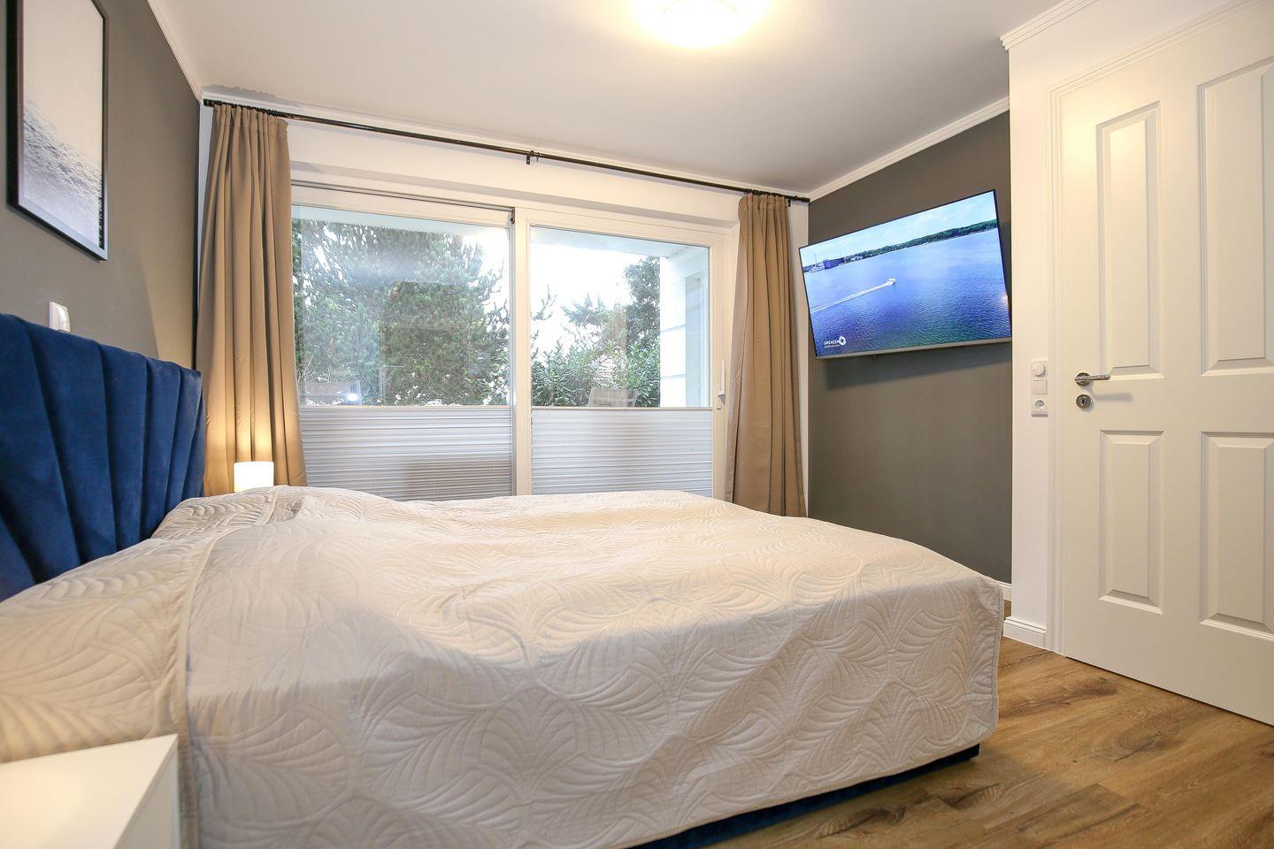 Das Schlafzimmer der Ferienwohnung ist mit einem komfortablen Boxspringbett ( 180 x 200 cm) eingerichtet. Für deine Garderobe bietet der Kleiderschrank ausreichend Stauraum. Zudem erwartet dich hier ein zweiter Flachbild-TV. Zur Verdunklung dienen blickdichte Vorhänge an den Fenstern.