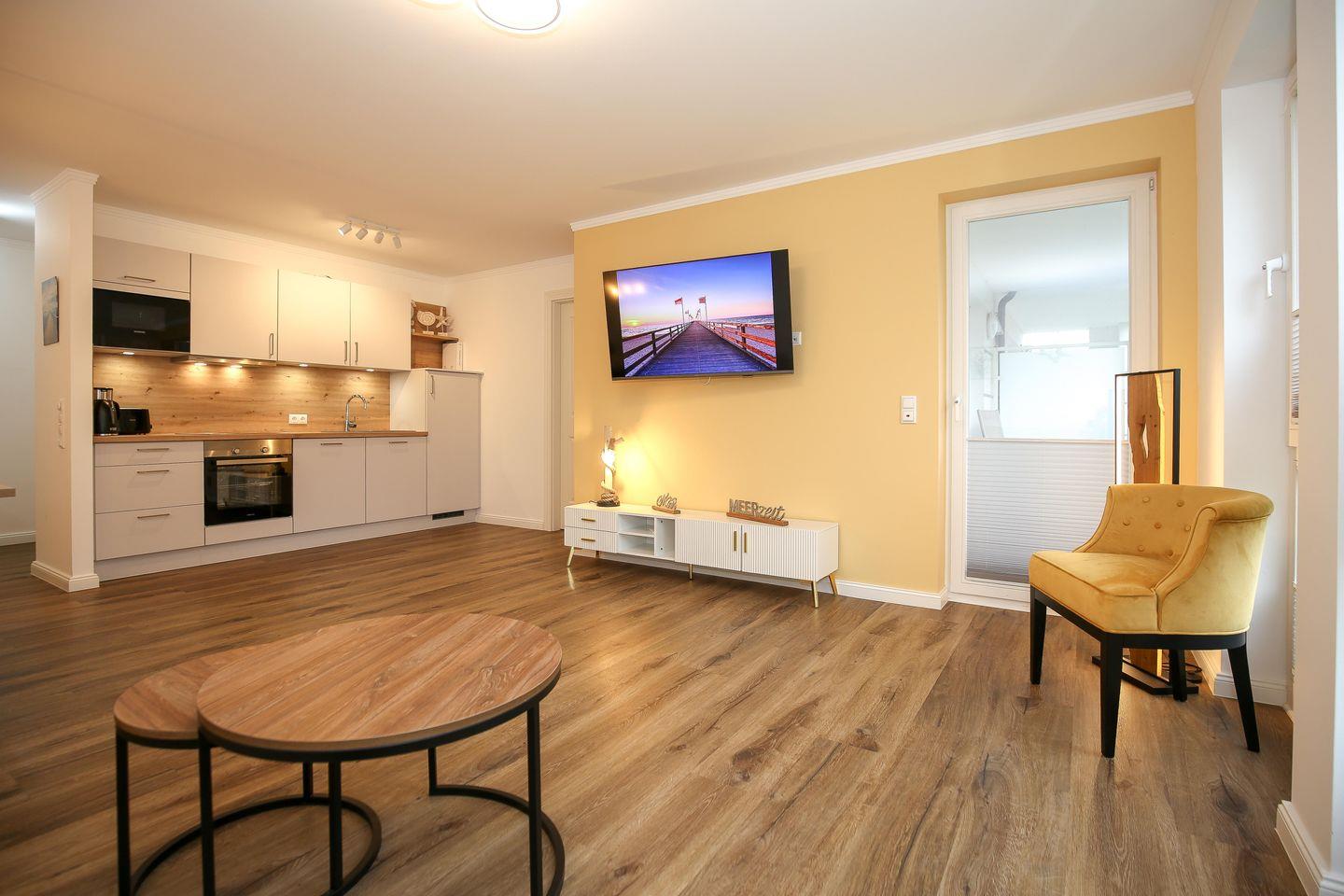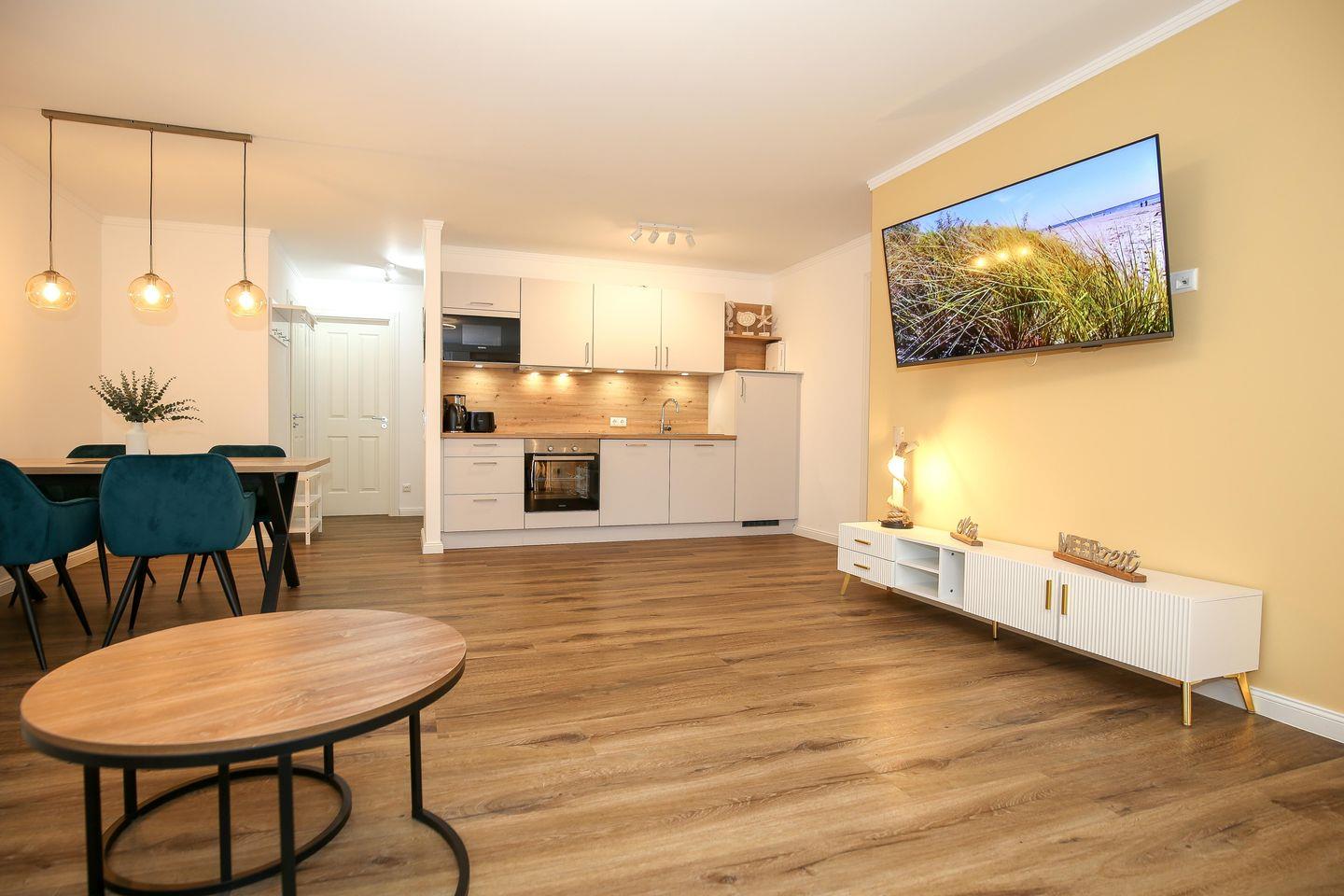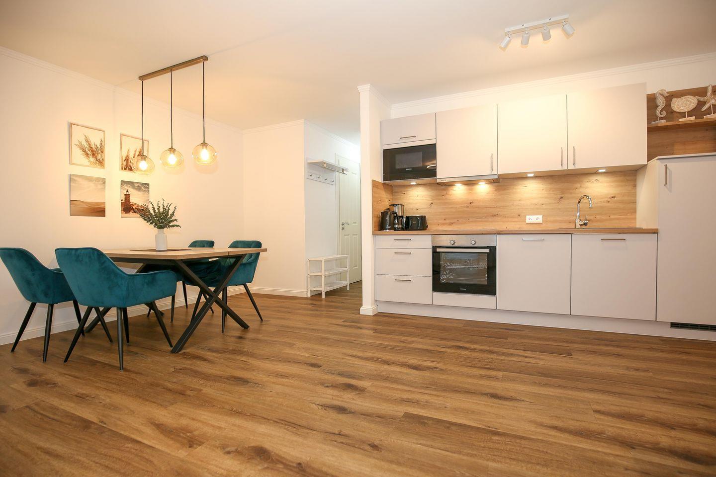 Die angrenzende offene Küchenzeile ist mit einem Kühlschrank mit Gefrierfach, einem Geschirrspüler, einem 4-Platten-Cerankochfeld, einer Mikrowelle und einem Backofen voll ausgestattet. Die Küchenausstattung wird komplettiert durch einen Toaster, eine Kaffeemaschine und einen Wasserkocher. Von hier aus hast du ebenfalls einen Blick auf die Ostsee.