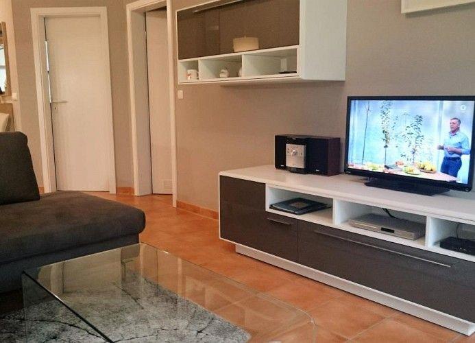 In einem der Räume gibt es ein Doppelbett (und einen zweiten Flachbild-TV...), in dem anderen ein Einzelbett, das mit wenigen Handgriffen zu einem Doppelbett umfunktioniert werden kann.